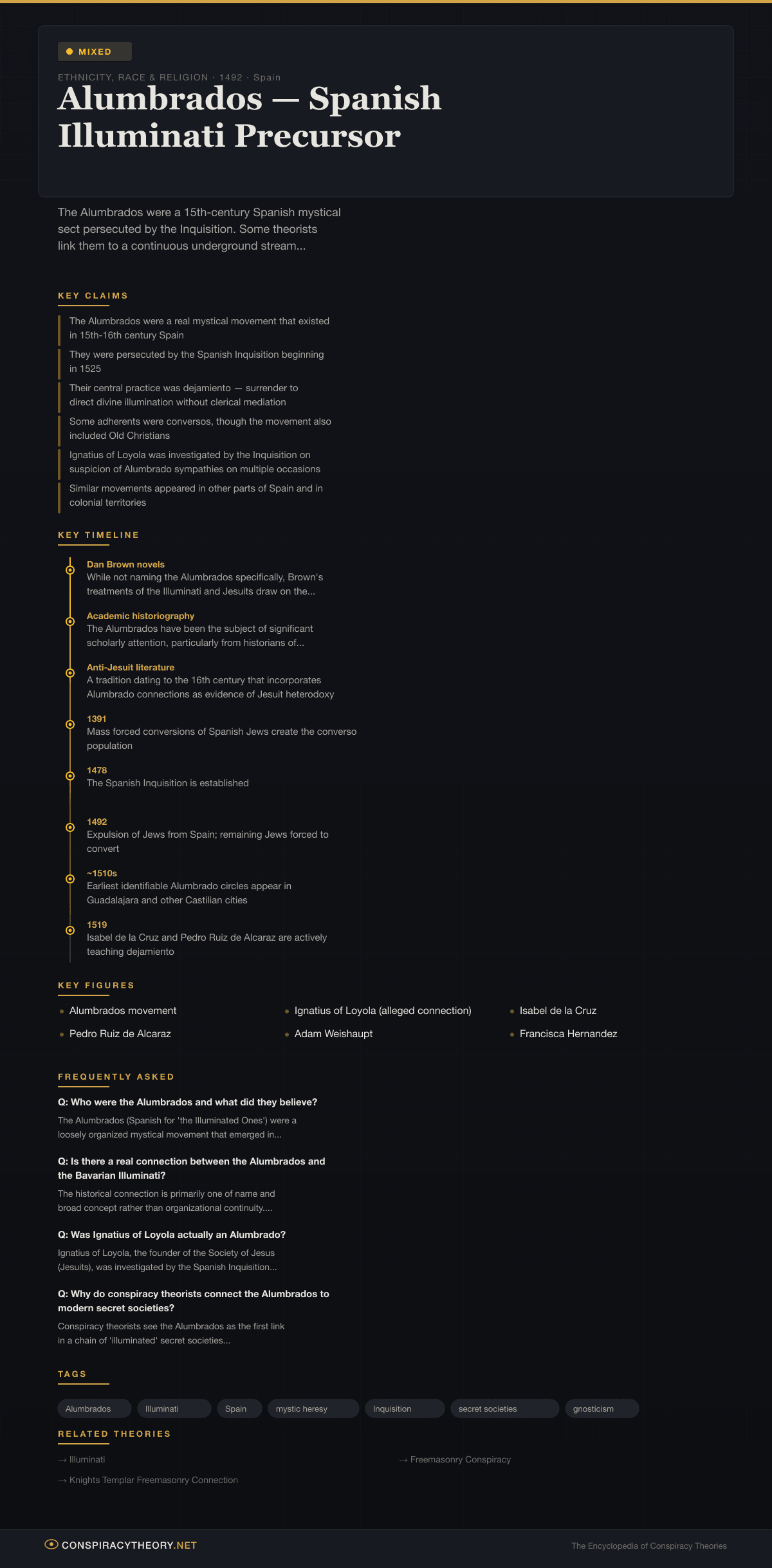 The Alumbrados are classified as mixed because the historical facts and the conspiracy theories diverge significantly. The Alumbrados genuinely existed, were genuinely persecuted, and genuinely influenced subsequent mystical movements. Some adherents did go underground after Inquisitorial persecution. Ignatius of Loyola was genuinely investigated for Alumbrado sympathies. These are documented historical facts. However, the conspiracy theory — that the Alumbrados represent the origin point of a continuous secret tradition that became the Illuminati and persists today — is not supported by historical evidence. The confirmed historical connections are modest; the conspiratorial extrapolations are vast.