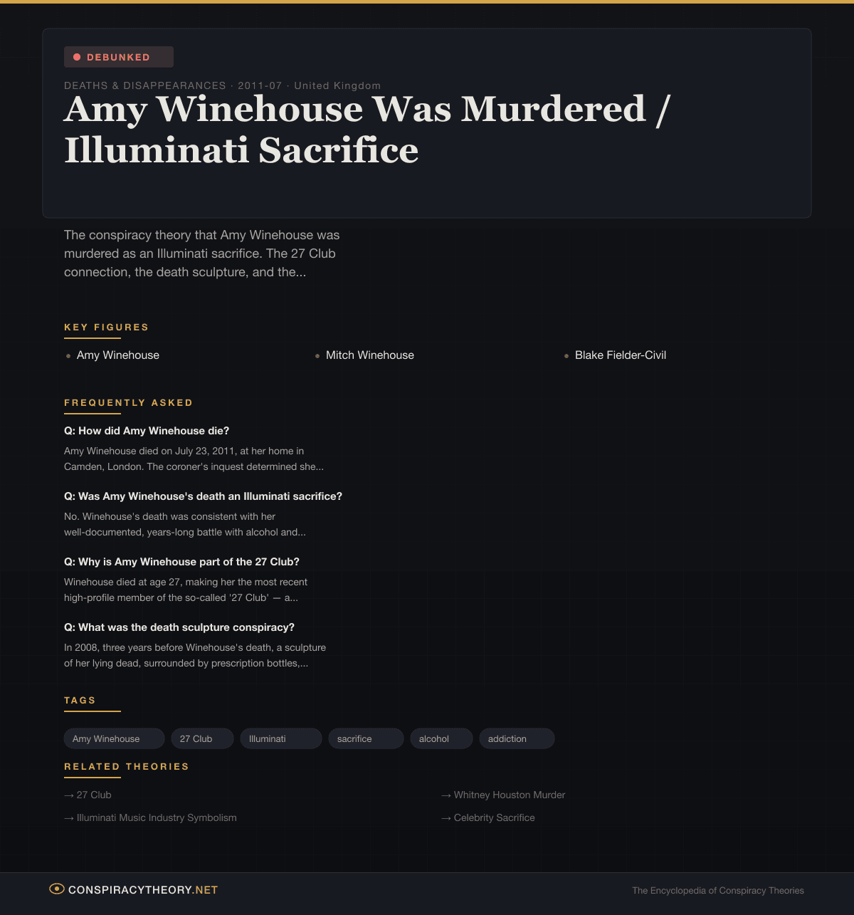 Within hours, a different explanation was circulating online: Amy Winehouse had been murdered. Sacrificed by the Illuminati. Taken out to join the 27 Club not because of addiction — the thing everyone had watched destroy her for years — but because a shadowy elite demanded blood.