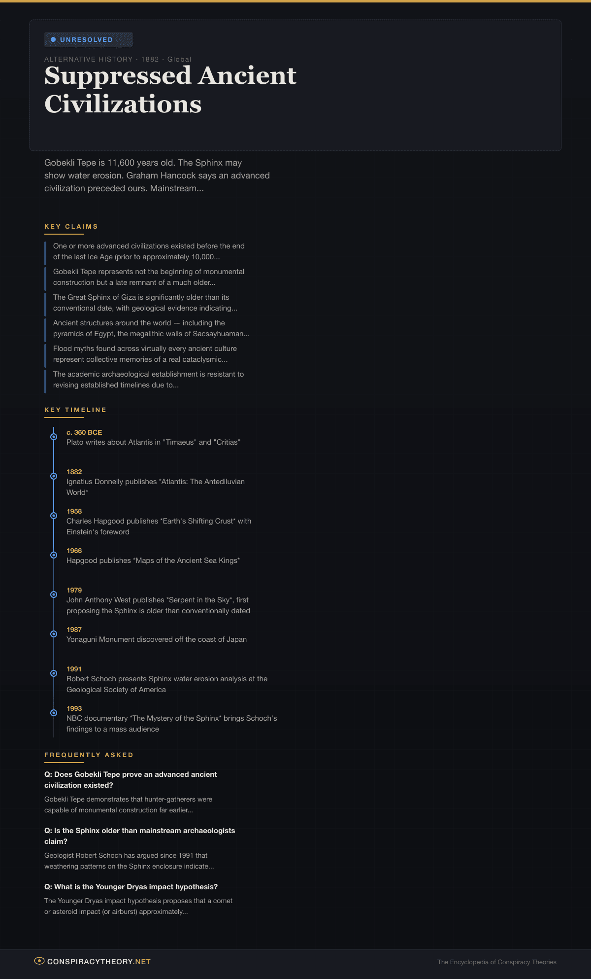 The suppressed ancient civilizations theory proposes that one or more technologically and culturally advanced human civilizations existed in deep prehistory — typically before the end of the last Ice Age, around 10,000 to 12,000 years ago — and that their existence has been either lost to catastrophe or actively suppressed by mainstream academic institutions. Proponents argue that anomalous archaeological sites, geological evidence, ancient myths, and unexplained architectural achievements point to a forgotten chapter of human history that conventional archaeology refuses to acknowledge.
