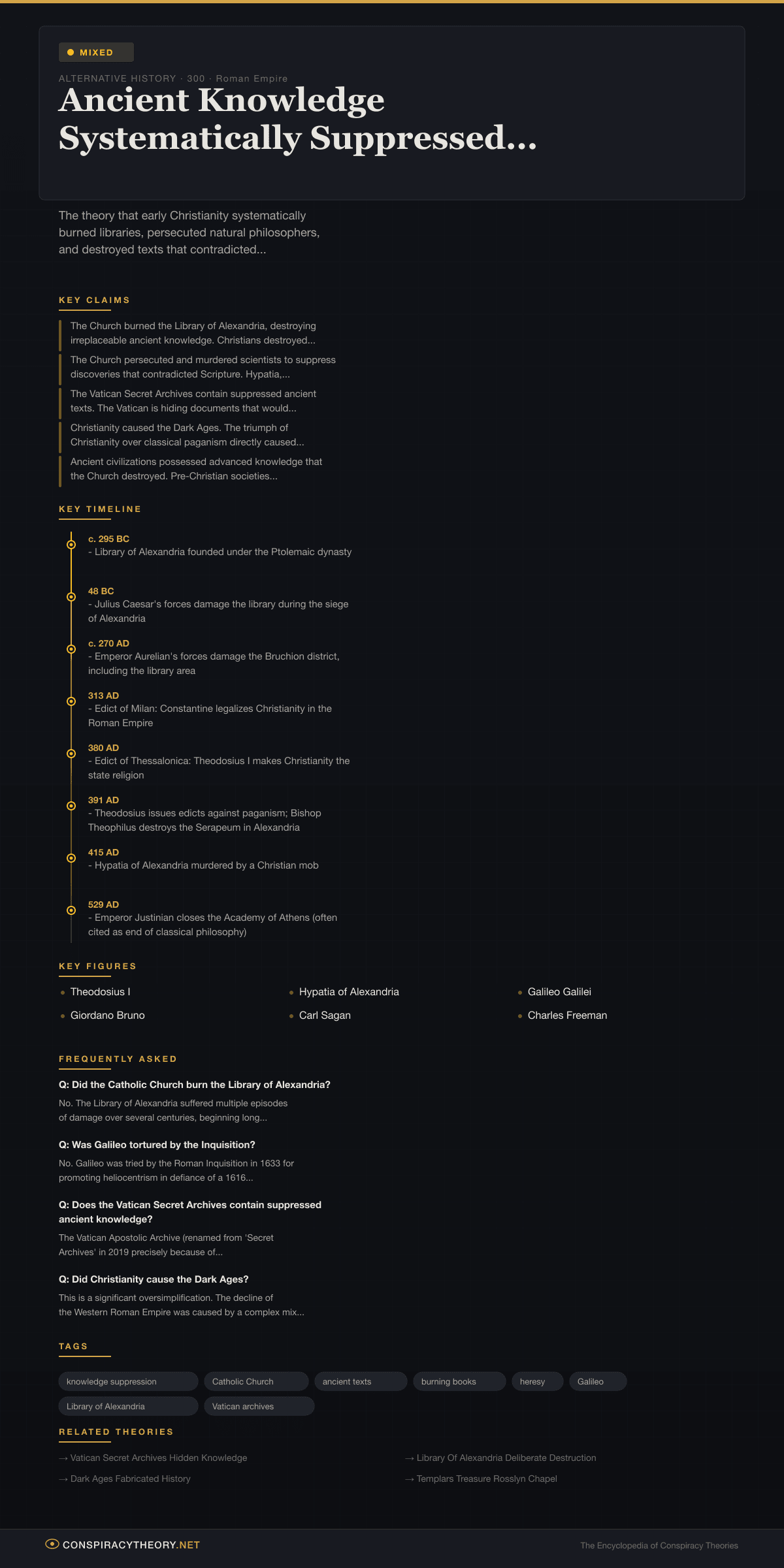 This theory is classified as mixed because the Church unquestionably engaged in acts of intellectual suppression (Galileo’s trial is a matter of record), while the broader narrative of systematic, civilization-destroying knowledge destruction is a modern myth that misrepresents both the scope of what was lost and who was responsible for losing it.