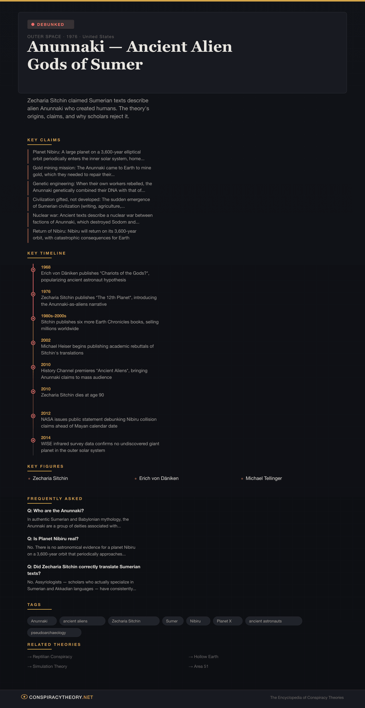 The Anunnaki ancient alien theory claims that an advanced extraterrestrial race from a planet called Nibiru visited Earth hundreds of thousands of years ago, genetically engineered Homo sapiens from existing hominids to serve as a slave labor force for gold mining, and were worshipped as gods by the ancient Sumerians. The theory was created almost entirely by Zecharia Sitchin (1920-2010), a self-taught Sumerian language enthusiast who published his interpretations in a series of books beginning with The 12th Planet (1976).