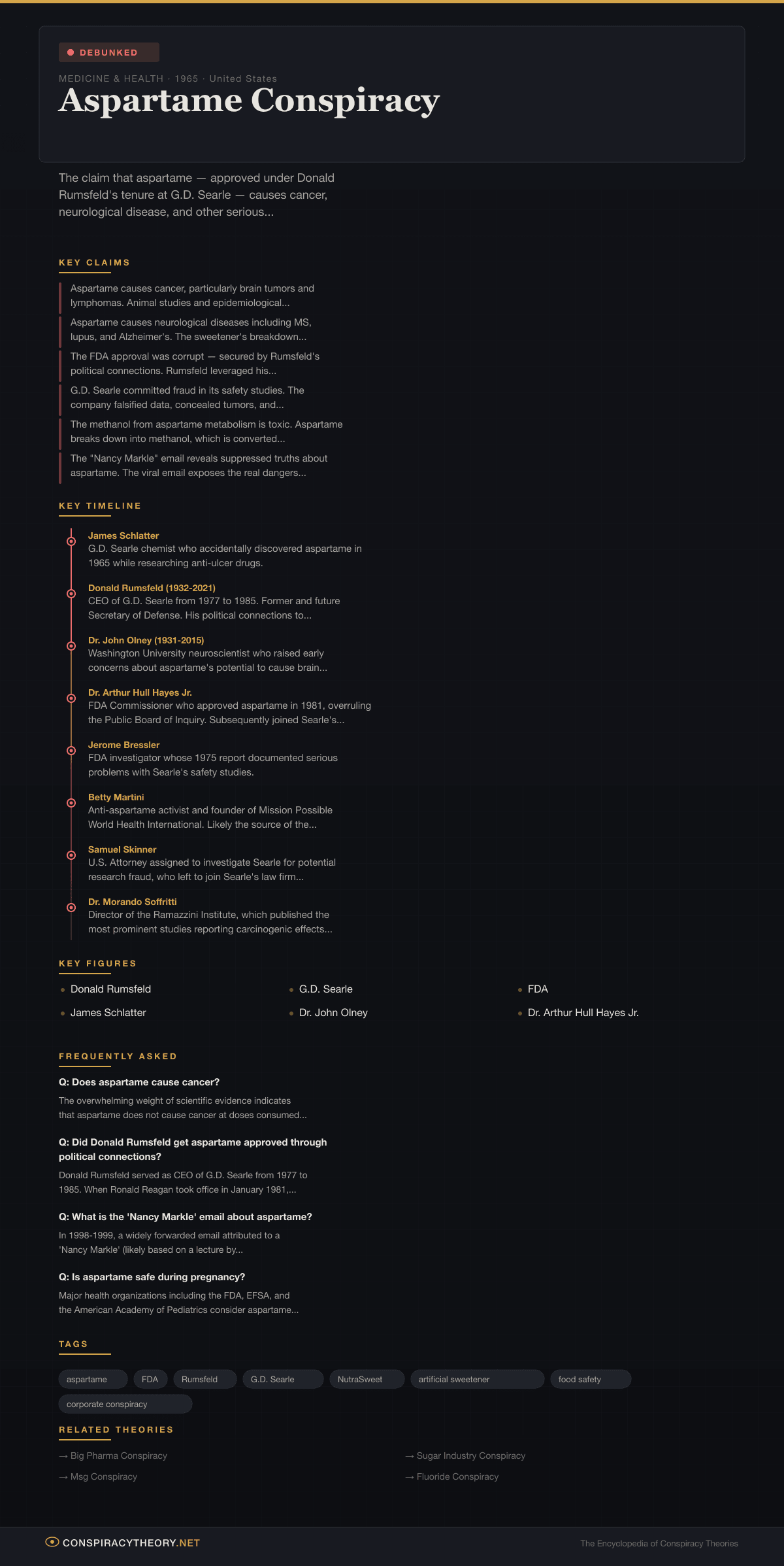 The conspiracy theory surrounding aspartame alleges that the sweetener causes a wide range of serious health conditions — including cancer, multiple sclerosis, lupus, seizures, brain tumors, and Alzheimer’s disease — and that its FDA approval was secured not through legitimate scientific evaluation but through the political machinations of Donald Rumsfeld, who served as CEO of G.D. Searle from 1977 to 1985 before becoming Secretary of Defense under Presidents Gerald Ford and later George W. Bush.