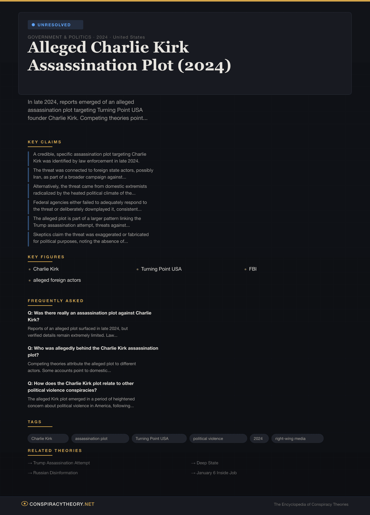 Status: Unresolved. The alleged Charlie Kirk assassination plot exists in an evidentiary gray zone. The claim has not been conclusively substantiated with public evidence (arrests, indictments, court documents), nor has it been definitively debunked. The absence of public confirmation does not necessarily mean the threat was not real — law enforcement routinely handles threats without public disclosure, and intelligence-related investigations may remain classified.