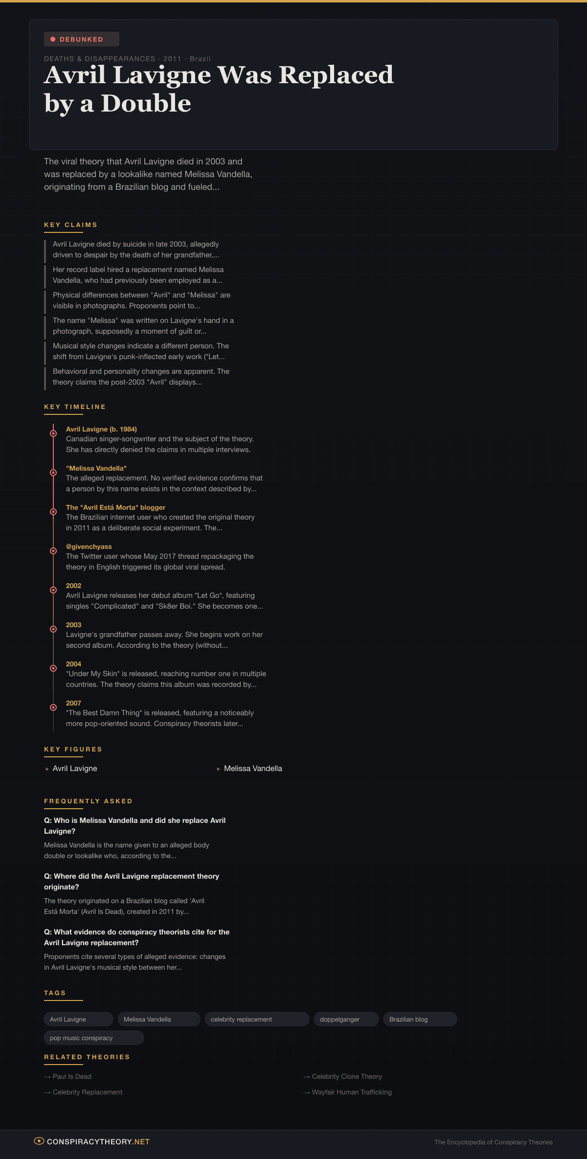 The theory claims that after the death of Lavigne’s close friend and the pressures of sudden fame caused her to take her own life in late 2003, her record label replaced her with a previously recruited body double named Melissa Vandella to protect its commercial investment. Proponents cite changes in Lavigne’s musical style, physical appearance, fashion sense, and handwriting as evidence of the substitution. These claims have been comprehensively debunked through photographic analysis, Lavigne’s own public statements, and the original blogger’s admission that the theory was fabricated as a demonstration project.