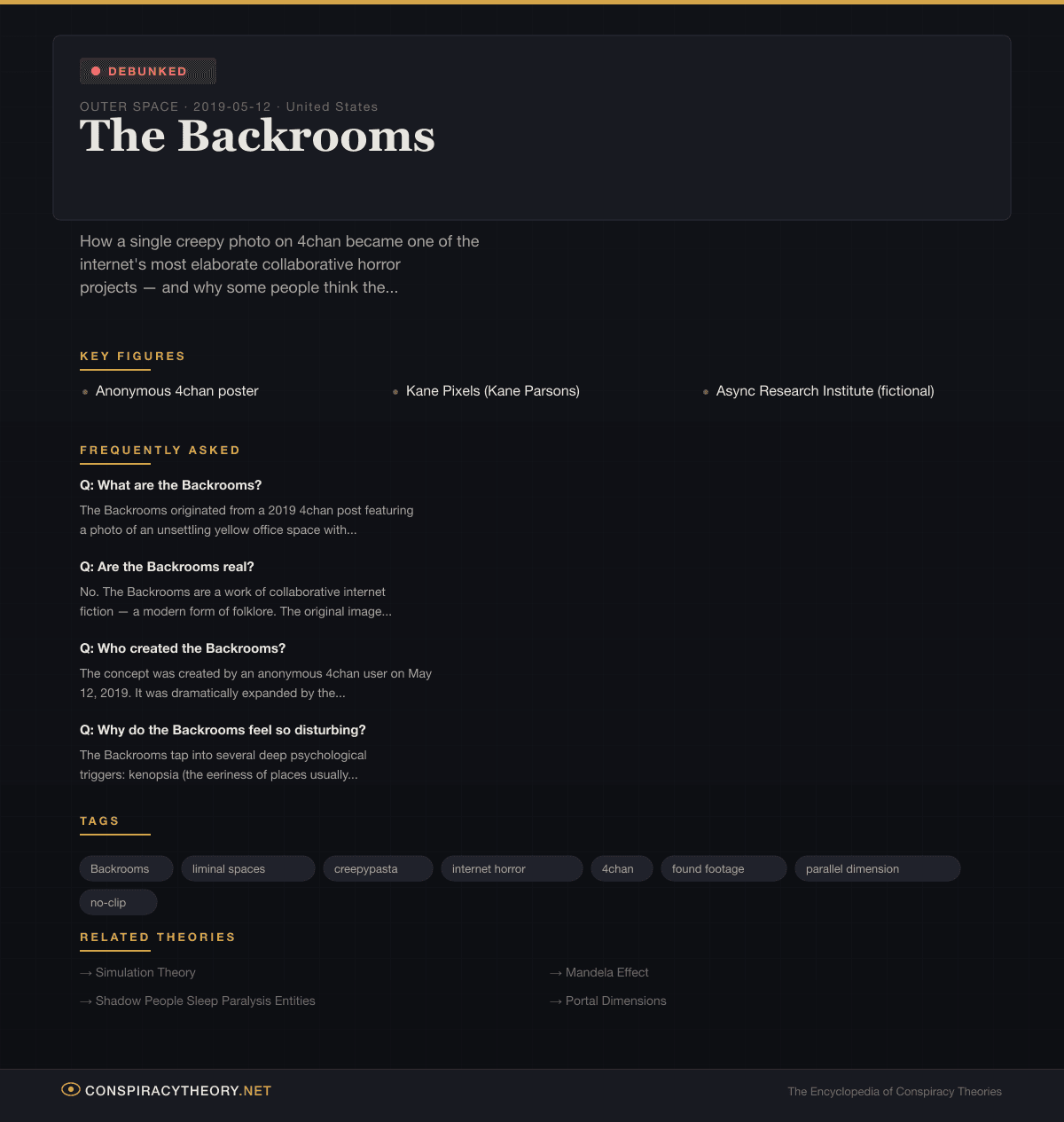 The Backrooms aren’t a conspiracy theory in the traditional sense. Nobody is covering up the existence of an infinite yellow office dimension. But they live in the same cultural space as conspiracy theories — they emerge from the same internet communities, spread through the same channels, and for a surprising number of people, the line between “this is a cool horror concept” and “what if this is actually real?” gets blurry in the middle of the night.