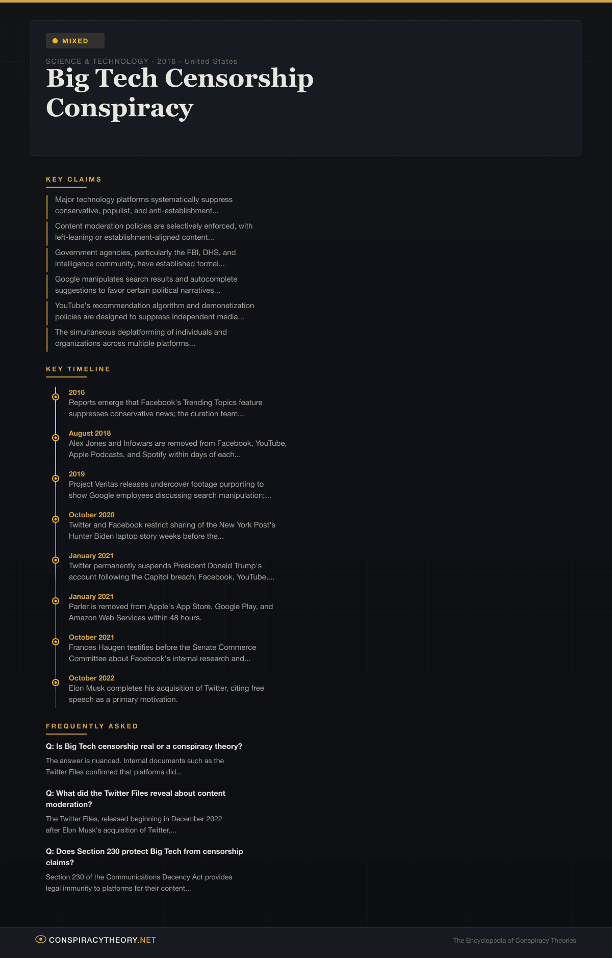 The Big Tech censorship conspiracy encompasses a broad set of claims alleging that major technology companies — primarily Meta (Facebook and Instagram), Google (including YouTube), X (formerly Twitter), Apple, and Amazon — engage in coordinated or systematic suppression of political speech, particularly targeting conservative, populist, and anti-establishment viewpoints. Proponents argue that content moderation policies, algorithmic curation, search result manipulation, and deplatforming practices amount to political censorship wielded by a small number of unelected corporate executives who hold unprecedented power over public discourse.