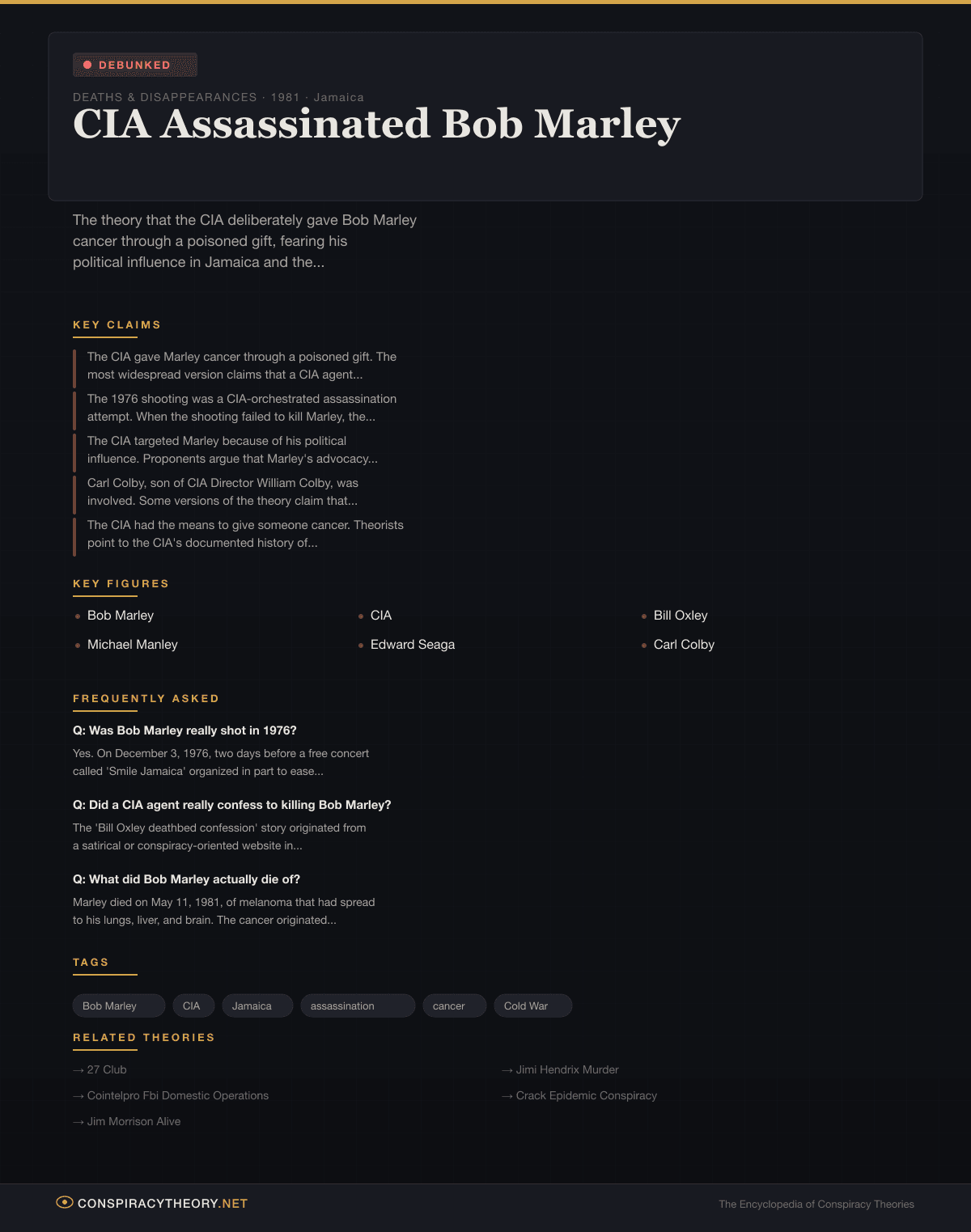 The theory draws its energy from a real historical context: the CIA’s documented interference in Jamaican politics during the Cold War, the genuine 1976 shooting that nearly killed Marley, and the broader pattern of CIA operations to destabilize governments and neutralize political figures throughout Latin America and the Caribbean. However, the specific claims about cancer injection have no basis in medical science, and the “Bill Oxley confession” that anchors the most popular version of the theory is a fabrication that originated on unreliable websites.