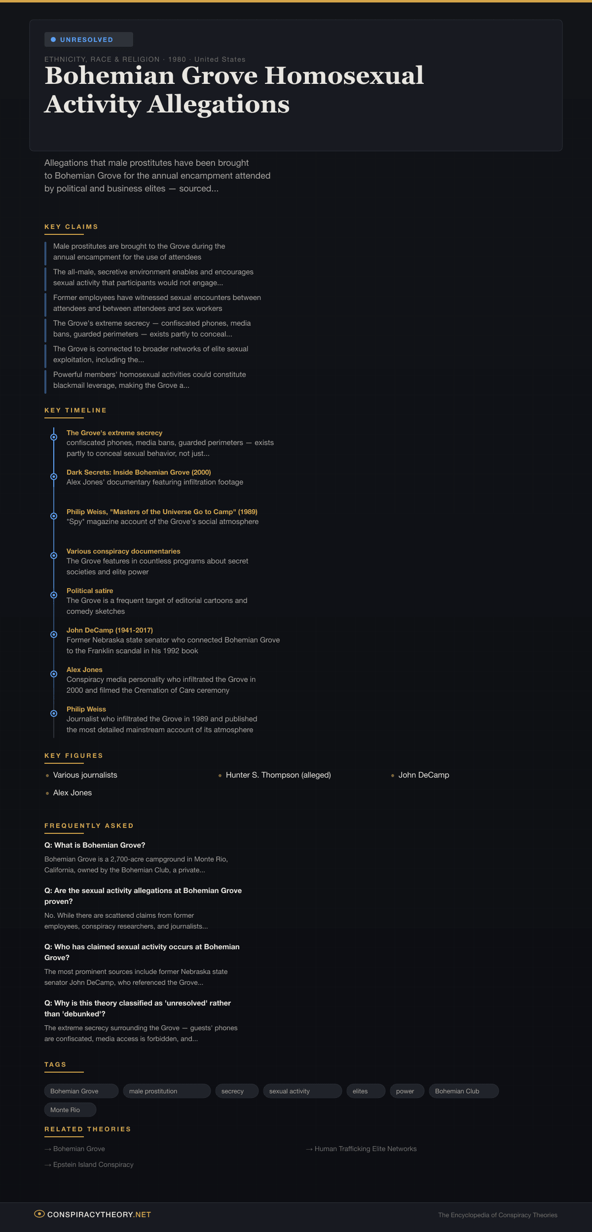 The sexual allegations are a relatively minor component of the broader Bohemian Grove conspiracy complex, which also includes claims about policy coordination, Satanic ritual, and New World Order planning. However, they serve an important narrative function: they make the Grove seem not just powerful but depraved, adding moral urgency to what might otherwise be simply a complaint about elite exclusivity.