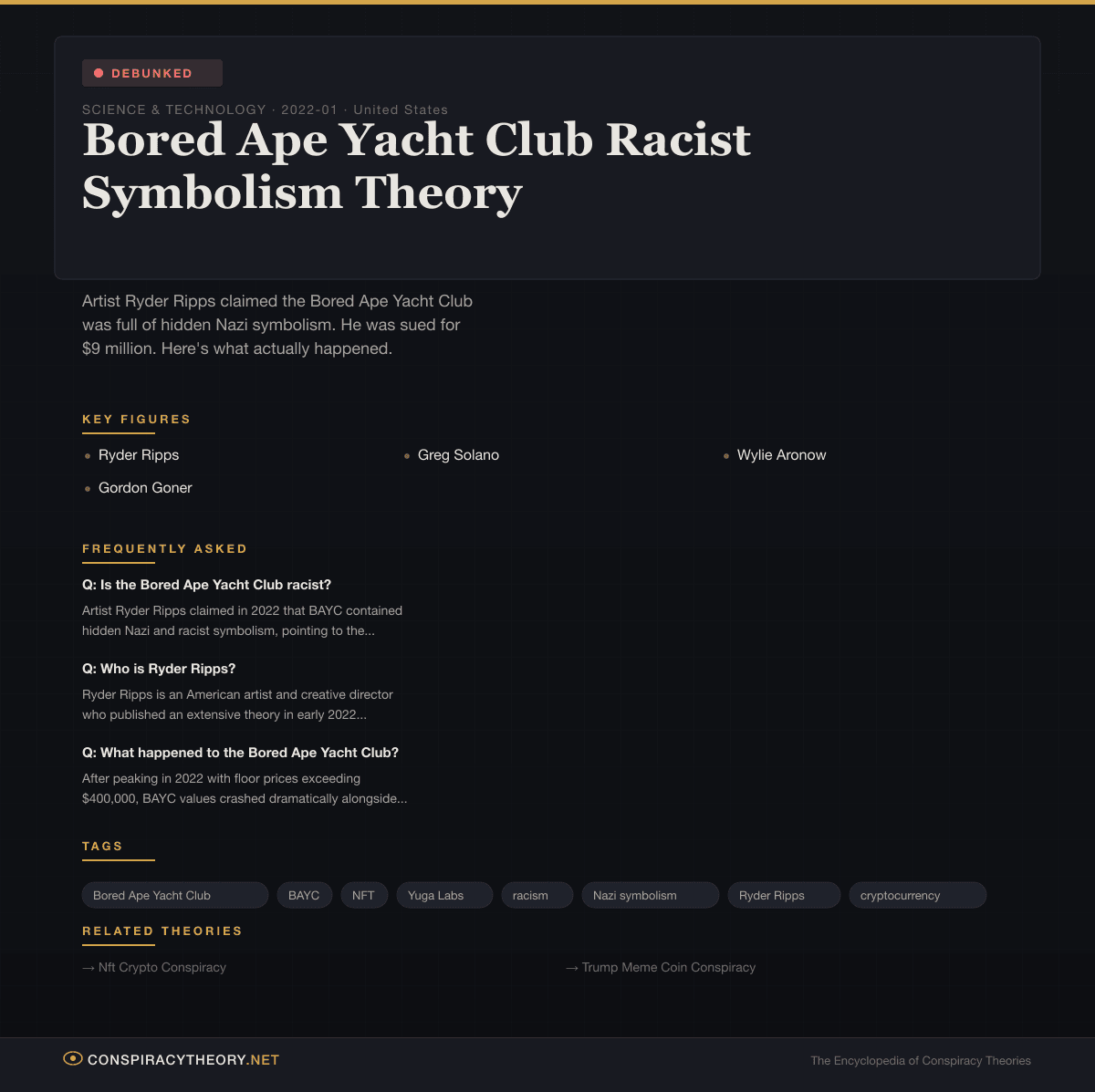 In early 2022, at the absolute zenith of NFT mania — when a cartoon ape in a sailor hat could sell for more than a house in the Hamptons — an artist named Ryder Ripps published one of the strangest conspiracy theories of the crypto era. His claim: the Bored Ape Yacht Club, the most famous NFT collection on the planet, was a secret vehicle for Nazi and white supremacist symbolism. The company name, the logo, the ape imagery itself — all of it, Ripps argued, was a carefully encoded message to those who knew where to look.