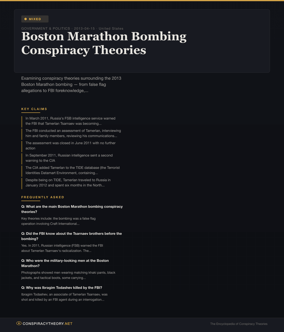 The bombing and its aftermath generated a significant body of conspiracy theories, fueled by several genuinely anomalous elements: the FBI’s prior knowledge of the Tsarnaev brothers through Russian intelligence warnings, the presence of military-contractor-style operatives at the scene, the killing of a key witness (Ibragim Todashev) during FBI interrogation, and the extreme militarized response that appeared disproportionate to the threat of two individuals.