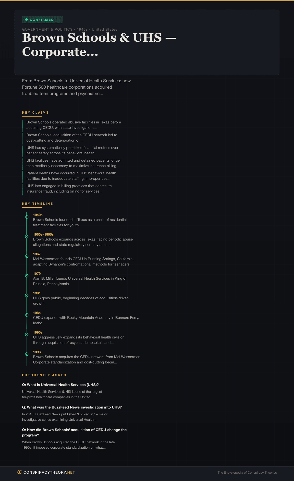 There is a particular kind of American story that unfolds at the intersection of Wall Street and human suffering — where the language of shareholder value and quarterly earnings is applied to institutions responsible for the most vulnerable people in the country. Brown Schools and Universal Health Services represent one of the clearest examples of this phenomenon: the systematic corporatization of behavioral health care and the troubled teen industry, producing a decades-long pattern of abuse, neglect, patient deaths, and insurance fraud that stretches from a chain of Texas group homes in the 1940s to a Fortune 500 company operating over four hundred facilities today.