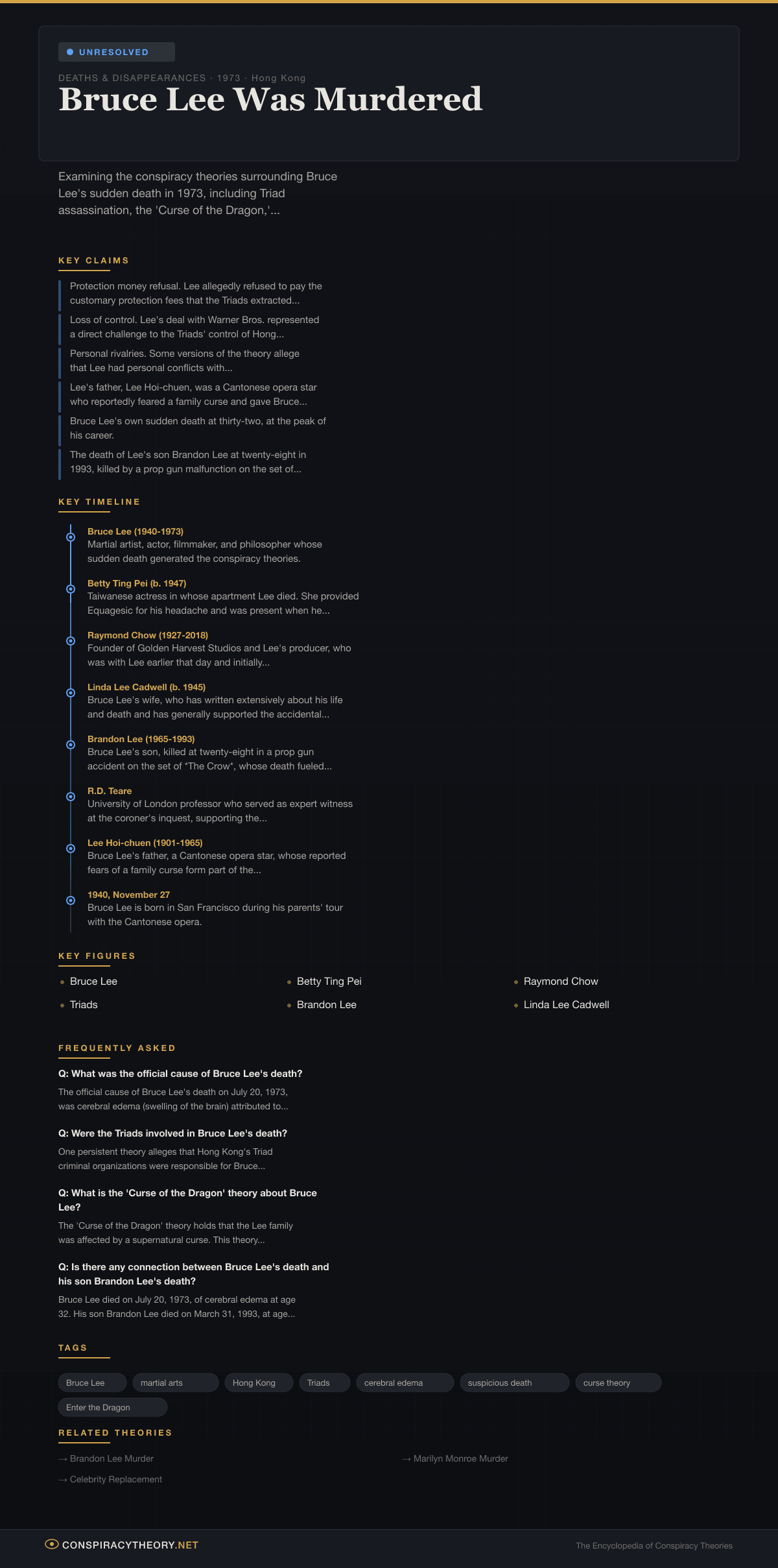 Conspiracy theories about Lee’s death fall into several categories: Triad assassination (either for refusing protection money or for challenging Triad control of the film industry); poisoning by a jealous rival or business associate; a “dim mak” or “death touch” delivered by a martial arts master; and the “Curse of the Dragon,” a supernatural theory that gained enormous traction after Lee’s son Brandon Lee was killed in a freak accident on a film set in 1993. The case is classified as unresolved — the official medical explanation has legitimate weaknesses, and while none of the conspiracy theories have been proven, the circumstances remain sufficiently ambiguous to sustain ongoing inquiry.