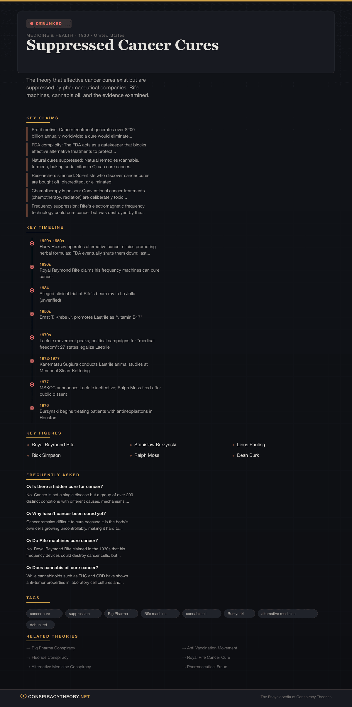 The suppressed cancer cure conspiracy theory claims that effective treatments for cancer have been discovered but are deliberately hidden from the public by pharmaceutical companies, medical establishments, and government agencies because cancer treatment is more profitable than a cure. The theory encompasses dozens of alleged suppressed remedies — from Royal Raymond Rife’s frequency machines in the 1930s to cannabis oil, Laetrile, high-dose vitamin C, and Stanislaw Burzynski’s antineoplastons.