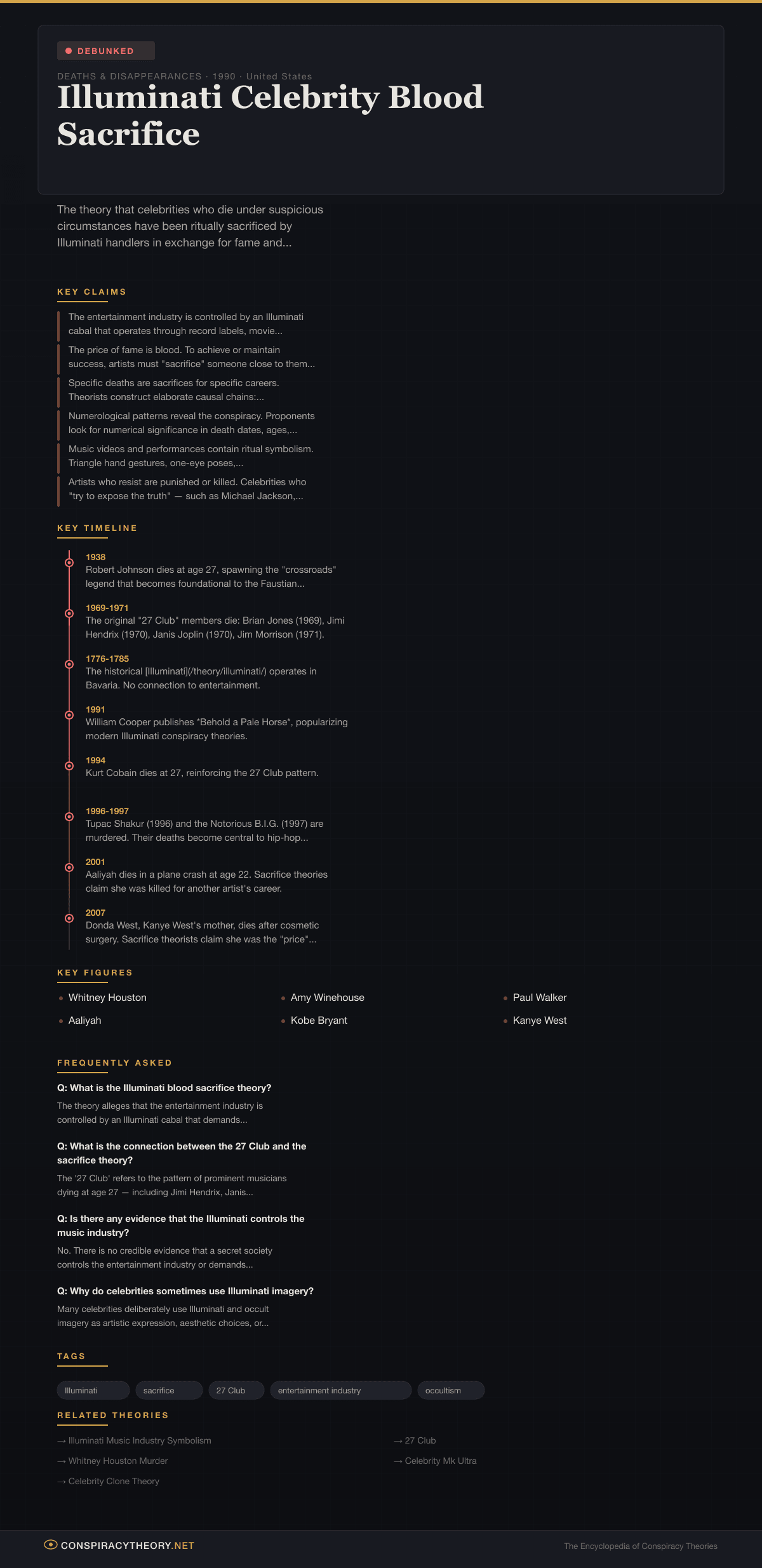 The Illuminati blood sacrifice theory is one of the most widely circulated conspiracy theories in entertainment culture. It posits that fame is not earned through talent, hard work, and luck, but purchased through a Faustian bargain with a secret elite that demands blood in return. Every celebrity death becomes potential evidence. Every tragedy becomes a transaction. It is, at its core, a modern mythology — a way of making sense of the randomness of death and the apparent arbitrariness of who becomes famous and who doesn’t.