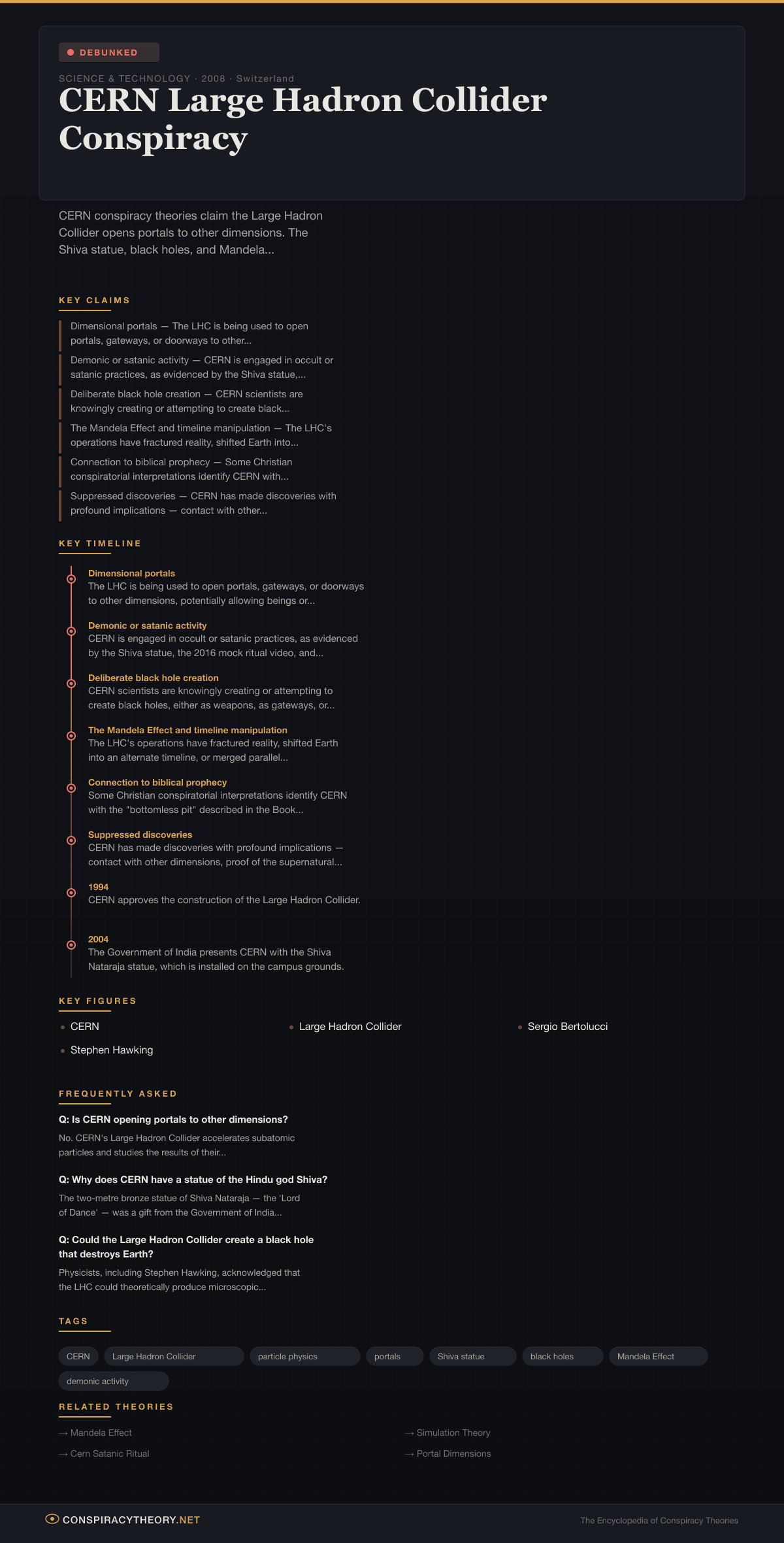 The CERN Large Hadron Collider conspiracy is a loosely connected cluster of theories alleging that the European Organization for Nuclear Research (CERN) and its Large Hadron Collider (LHC) — the world’s largest and most powerful particle accelerator, located beneath the Franco-Swiss border near Geneva — are being used for purposes far beyond the study of subatomic physics. Depending on the variant, proponents claim that CERN is opening portals or doorways to other dimensions, summoning demonic entities, deliberately risking the destruction of Earth by creating black holes, conducting secret satanic rituals on its campus, or inadvertently causing the Mandela Effect by fracturing timelines or shifting reality between parallel universes.