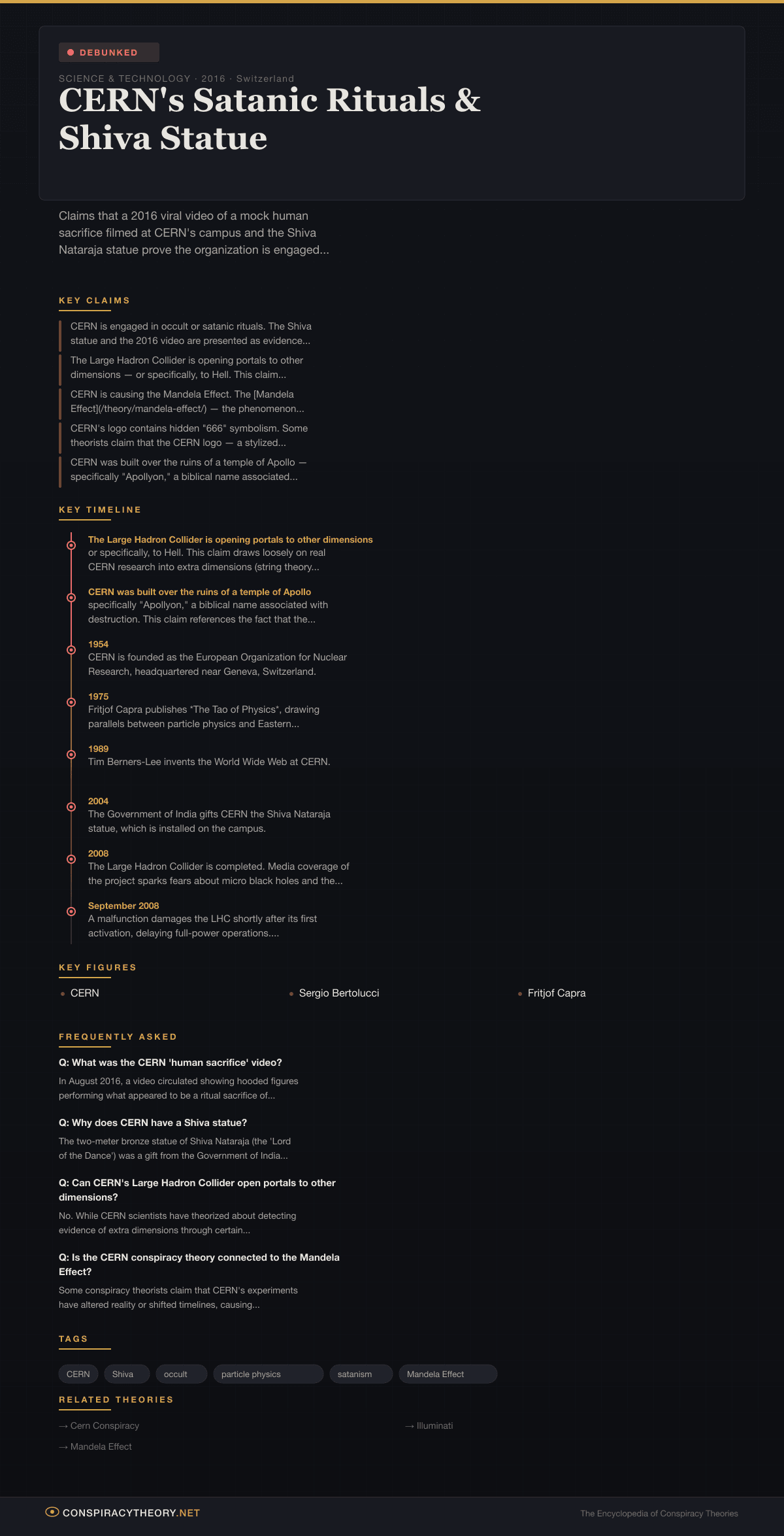 The CERN conspiracy theory — which gained explosive visibility in August 2016 when a video of a mock human sacrifice on the CERN campus went viral — sits at the intersection of several anxieties: fear of science that operates beyond public comprehension, distrust of elite international institutions, and a persistent cultural conviction that anyone doing things underground must be up to something diabolical. The theory is, in many ways, a twenty-first-century update of the Frankenstein myth: the idea that scientists in their hubris are tampering with forces they cannot control, and that the consequences will be cosmic.