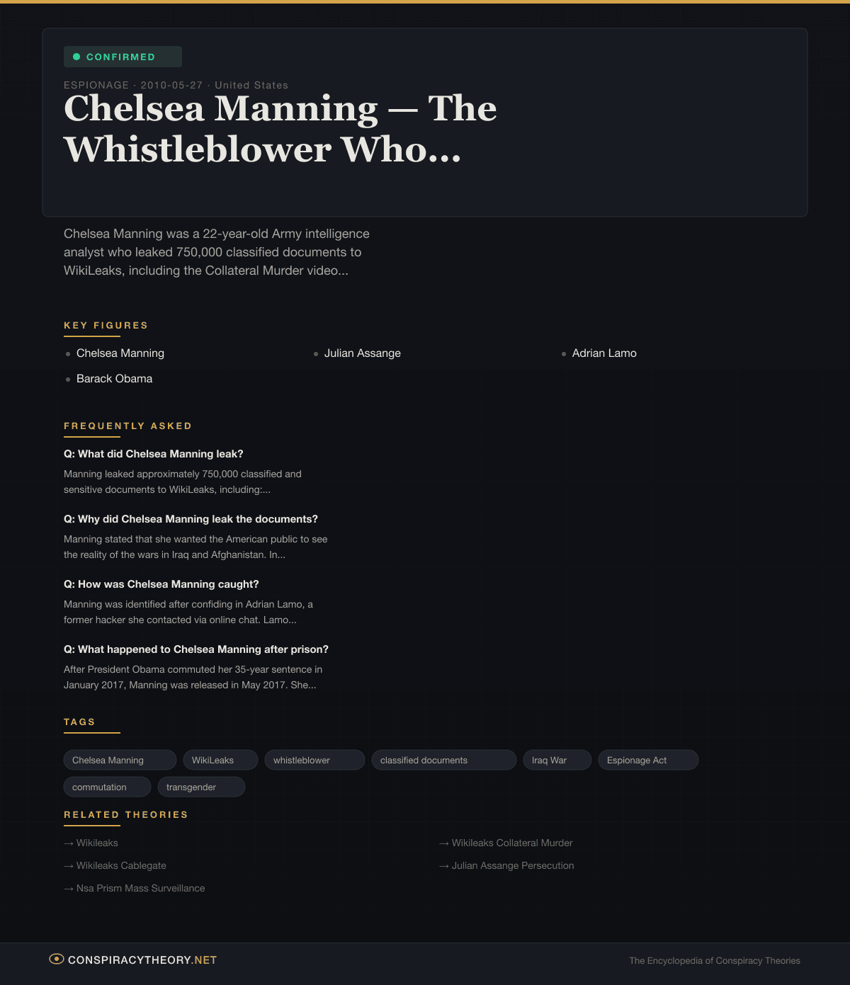 Manning sent the material to WikiLeaks. WikiLeaks published it. And the world changed — not dramatically, not overnight, but in ways that are still reverberating through American foreign policy, press freedom law, military culture, and the relationship between governments and the information they keep secret.