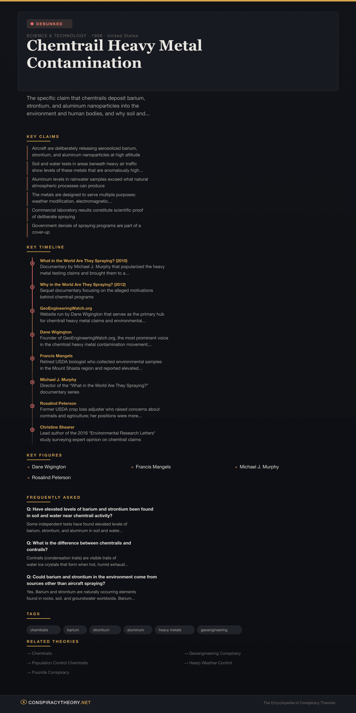 The chemtrail heavy metal contamination theory is a specific variant of the broader chemtrail conspiracy theory. It claims that the persistent white trails left by aircraft are not ordinary condensation trails (contrails) but rather deliberate releases of aerosolized barium, strontium, and aluminum nanoparticles into the atmosphere. Proponents assert that soil and water testing in areas beneath heavy air traffic reveals anomalously high concentrations of these metals, which they interpret as proof of a covert spraying program.