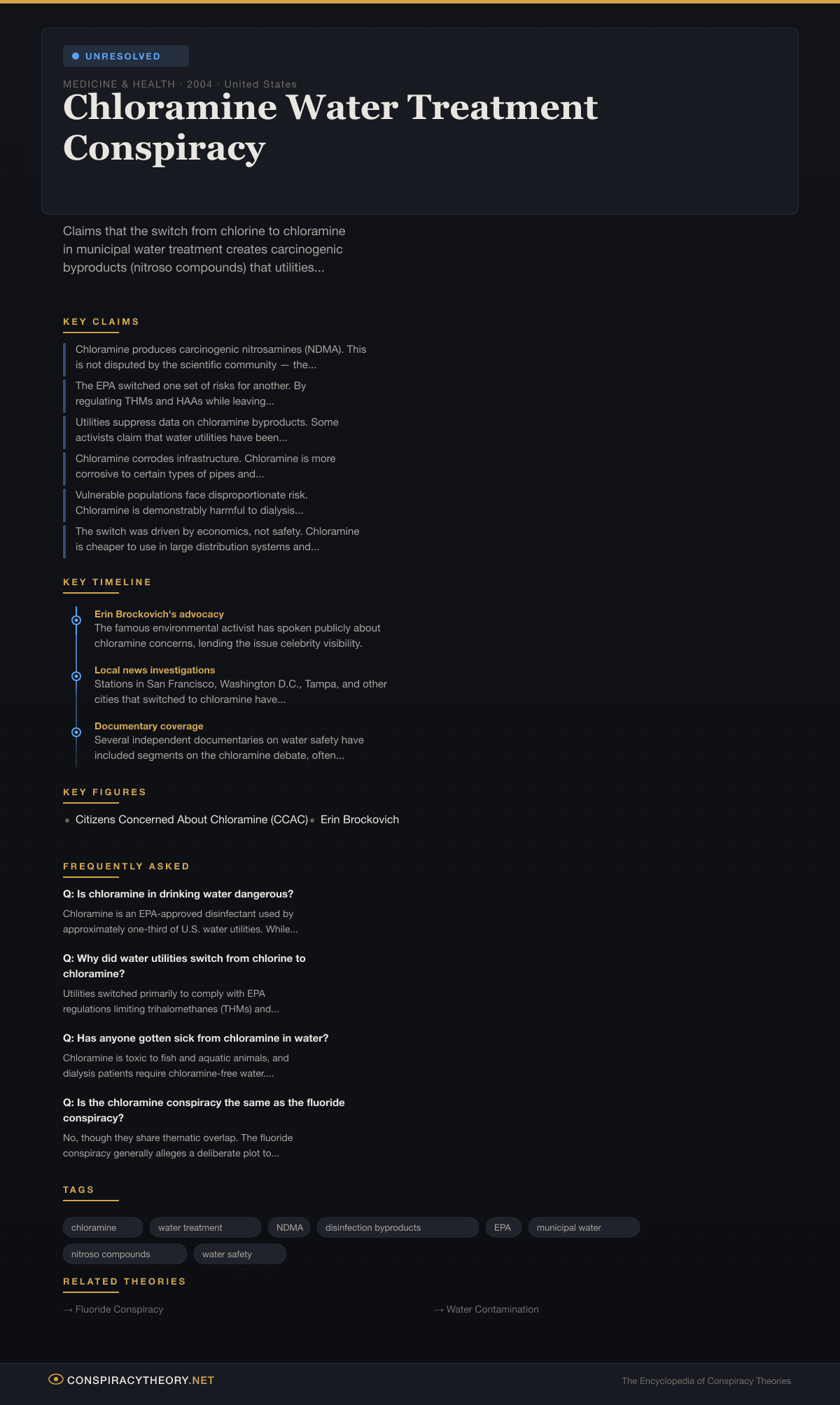 The chloramine controversy sits in an unusual space for a conspiracy theory: much of the underlying chemistry is real, the regulatory gaps are documented, and the concerns have been echoed by legitimate researchers. Whether the situation amounts to a conspiracy or simply a case of regulatory inertia and institutional reluctance to reverse course remains genuinely unresolved.