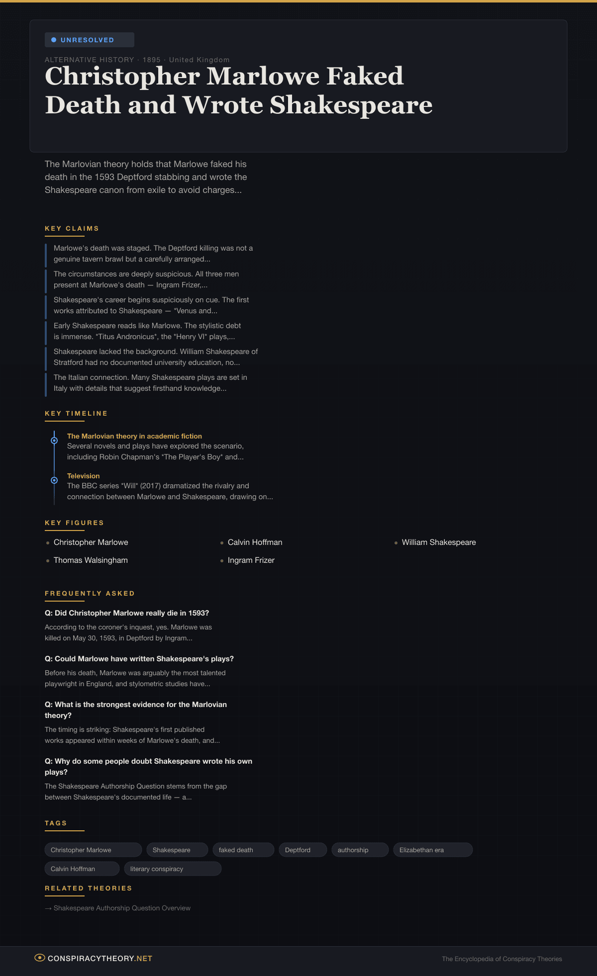 | 1895 | Wilbur Zeigler publishes It Was Marlowe, first articulation of the theory |