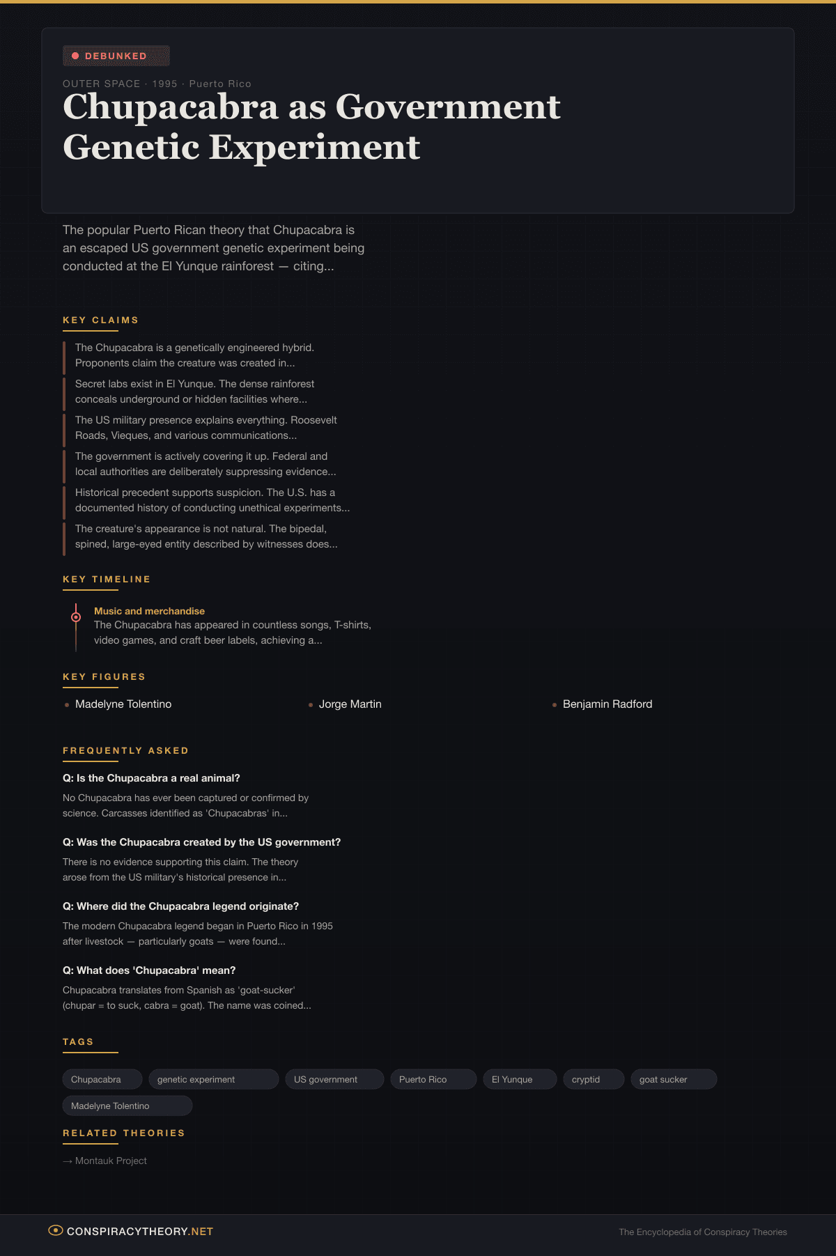 | 2010s-present | Chupacabra becomes established pop-culture icon; government-experiment theory persists in Puerto Rican communities |