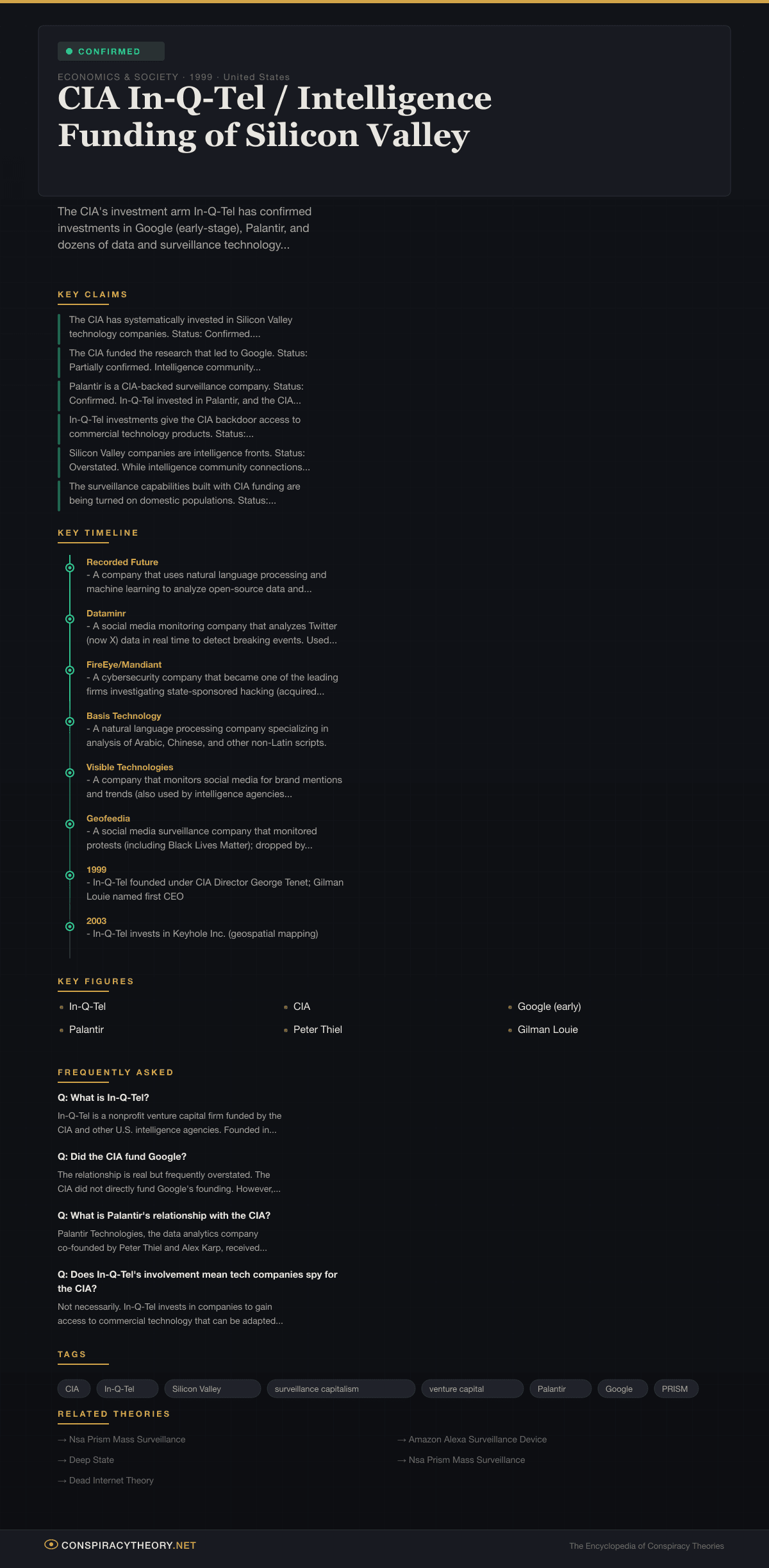 Silicon Valley companies are intelligence fronts. Status: Overstated. While intelligence community connections to Silicon Valley are extensive and documented, the claim that major technology companies are controlled by or operate at the direction of intelligence agencies is not supported by available evidence.
