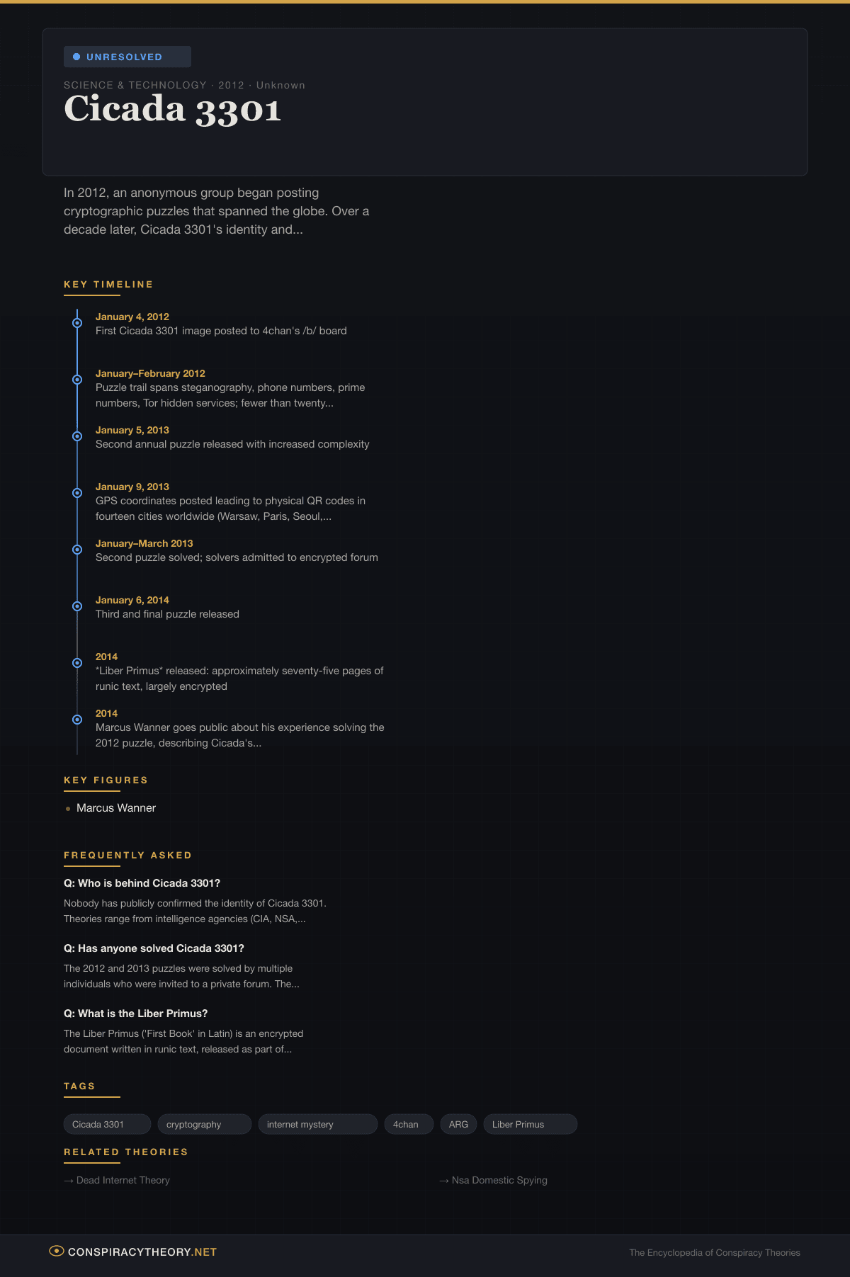 - 2014 — Marcus Wanner goes public about his experience solving the 2012 puzzle, describing Cicada’s libertarian, privacy-focused ideology