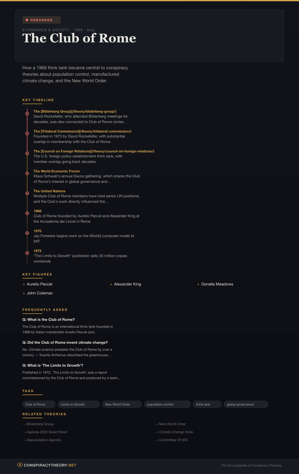 The Club of Rome conspiracy sits at the intersection of several related conspiracy theory clusters. For the broader alleged network of elite organizations, see the Bilderberg Group, the Trilateral Commission, and the New World Order. For John Coleman’s overarching framework placing the Club of Rome within a shadow government, see the Committee of 300. For the specific conspiracy theories the Club of Rome is accused of engineering, see Climate Change Hoax, the Depopulation Agenda, and Agenda 2030 & The Great Reset.