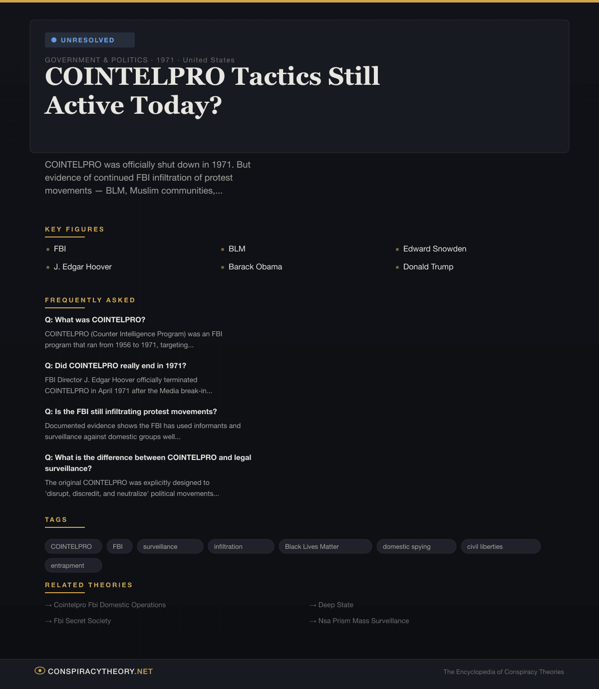 COINTELPRO is one of the few genuine confirmed conspiracies in American history. The FBI secretly targeted American citizens for political surveillance and disruption, lied about it, and was only exposed through an illegal break-in that the perpetrators got away with for 43 years.