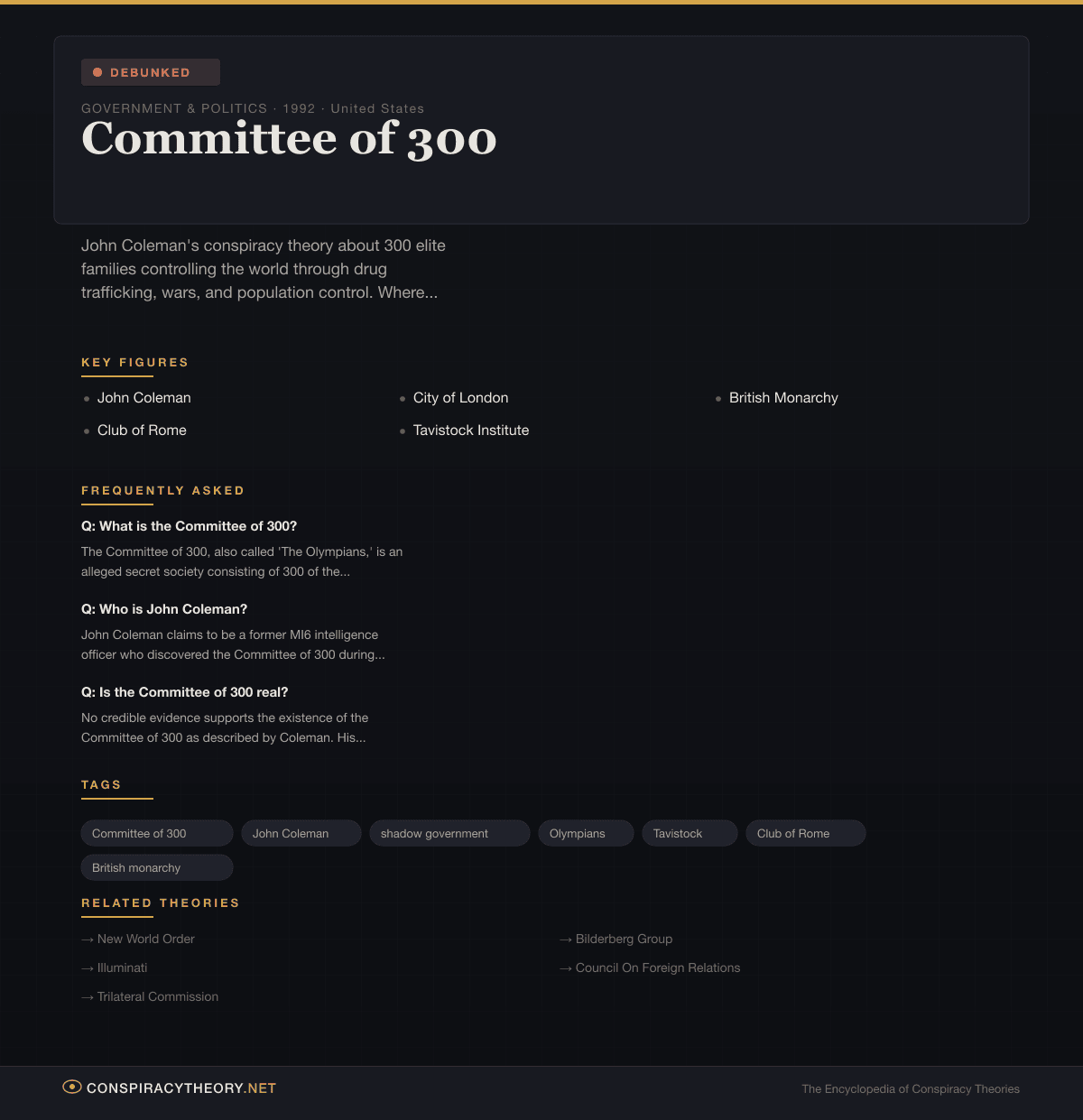In 1992, a man calling himself Dr. John Coleman published a book with a title that doesn’t exactly undersell its thesis: Conspirators’ Hierarchy: The Story of the Committee of 300. The book claimed that 300 of the world’s most powerful families — an inner circle Coleman called “The Olympians” — form a governing body that sits above all national governments, controlling the global drug trade, engineering wars, managing economic crises, and steering humanity toward a totalitarian one-world government with a dramatically reduced population.