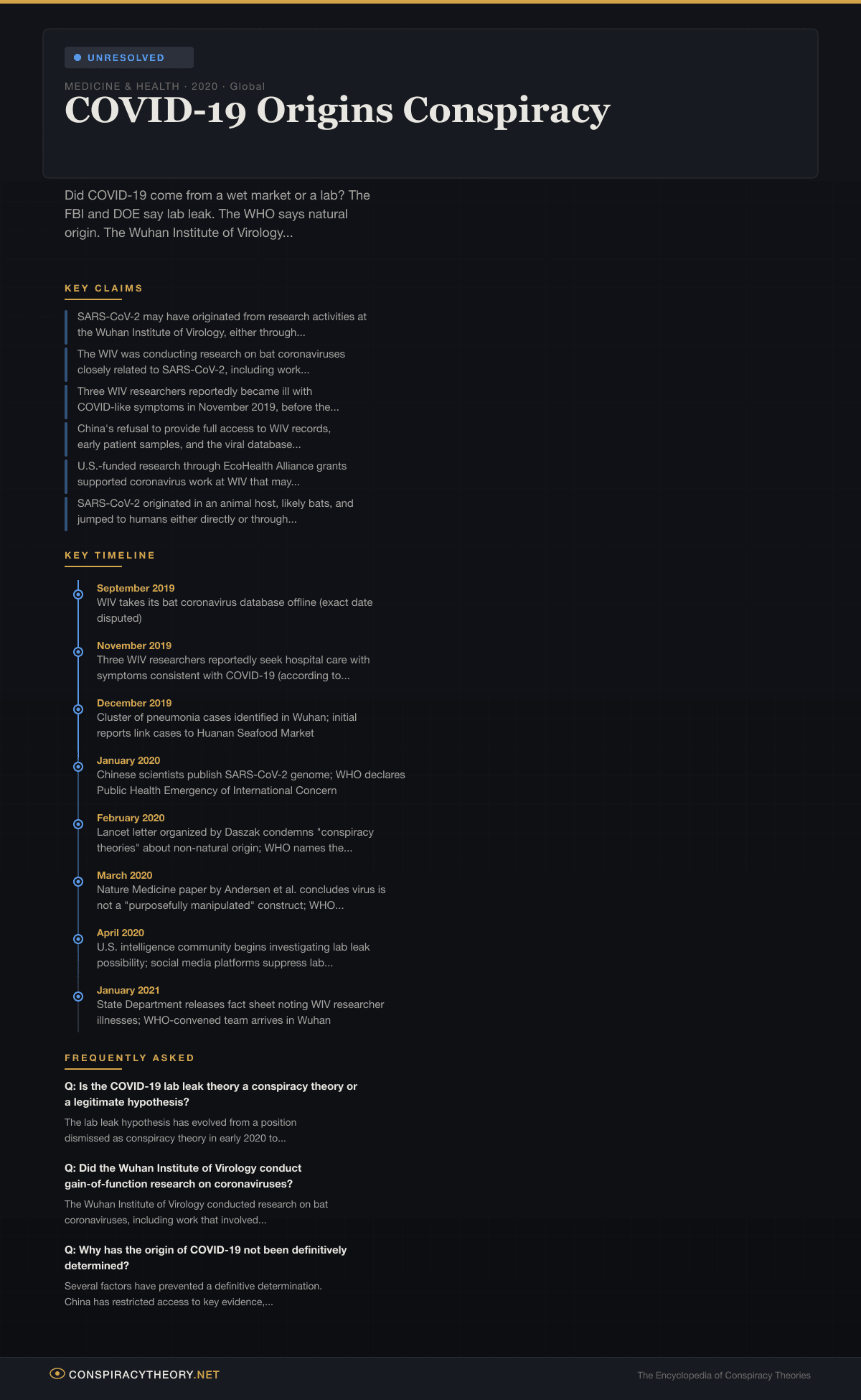 - COVID-19 Lab Leak — Detailed analysis of the laboratory origin hypothesis and its evidence