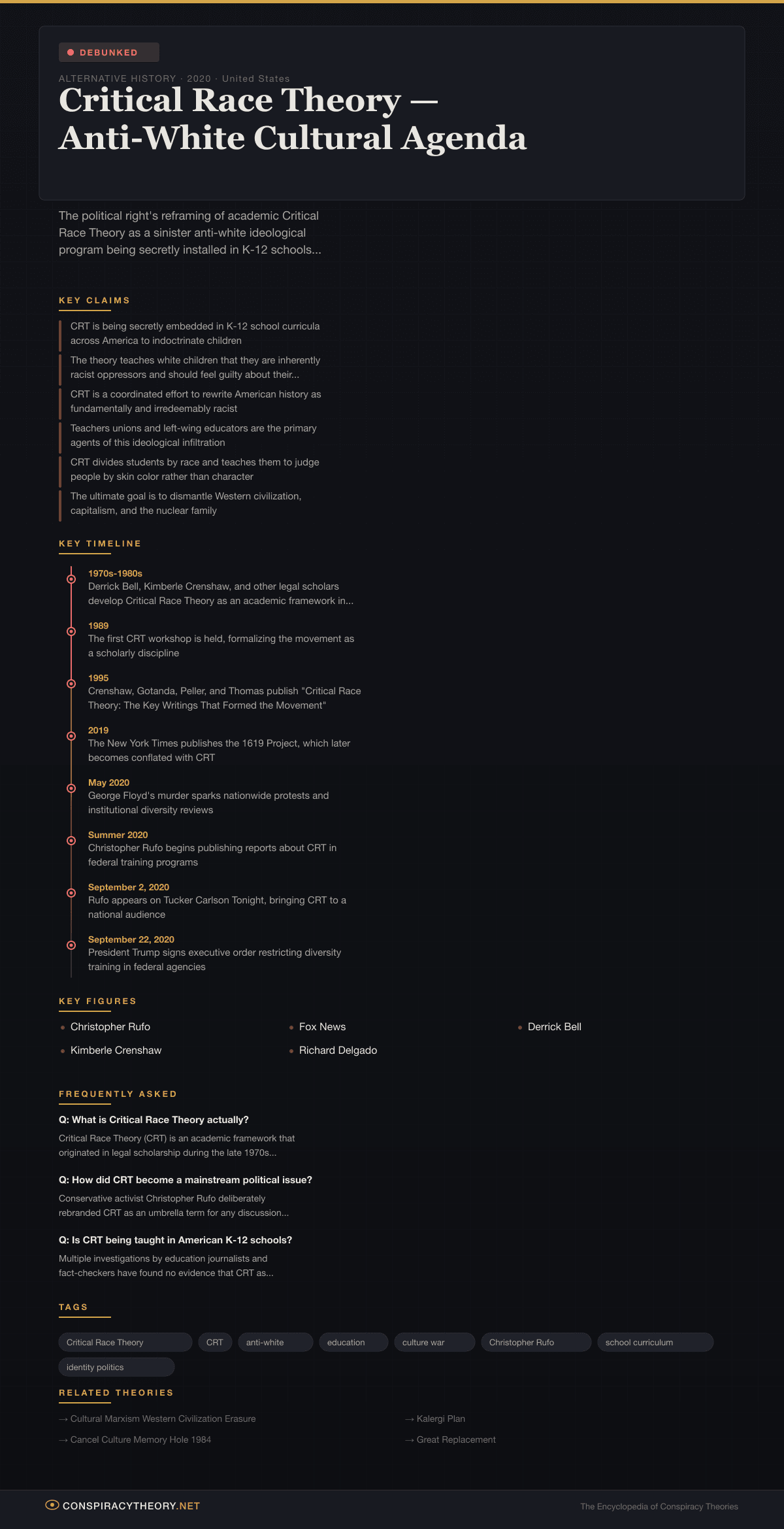 The conspiracy theory that Critical Race Theory (CRT) represents a coordinated anti-white agenda being covertly introduced into American K-12 schools emerged as a dominant political narrative in 2020-2021. Proponents claim that a network of left-wing academics, teachers unions, and government bureaucrats are deliberately indoctrinating children with an ideology designed to make white students feel guilty about their race, rewrite American history as fundamentally racist, and undermine Western civilization.