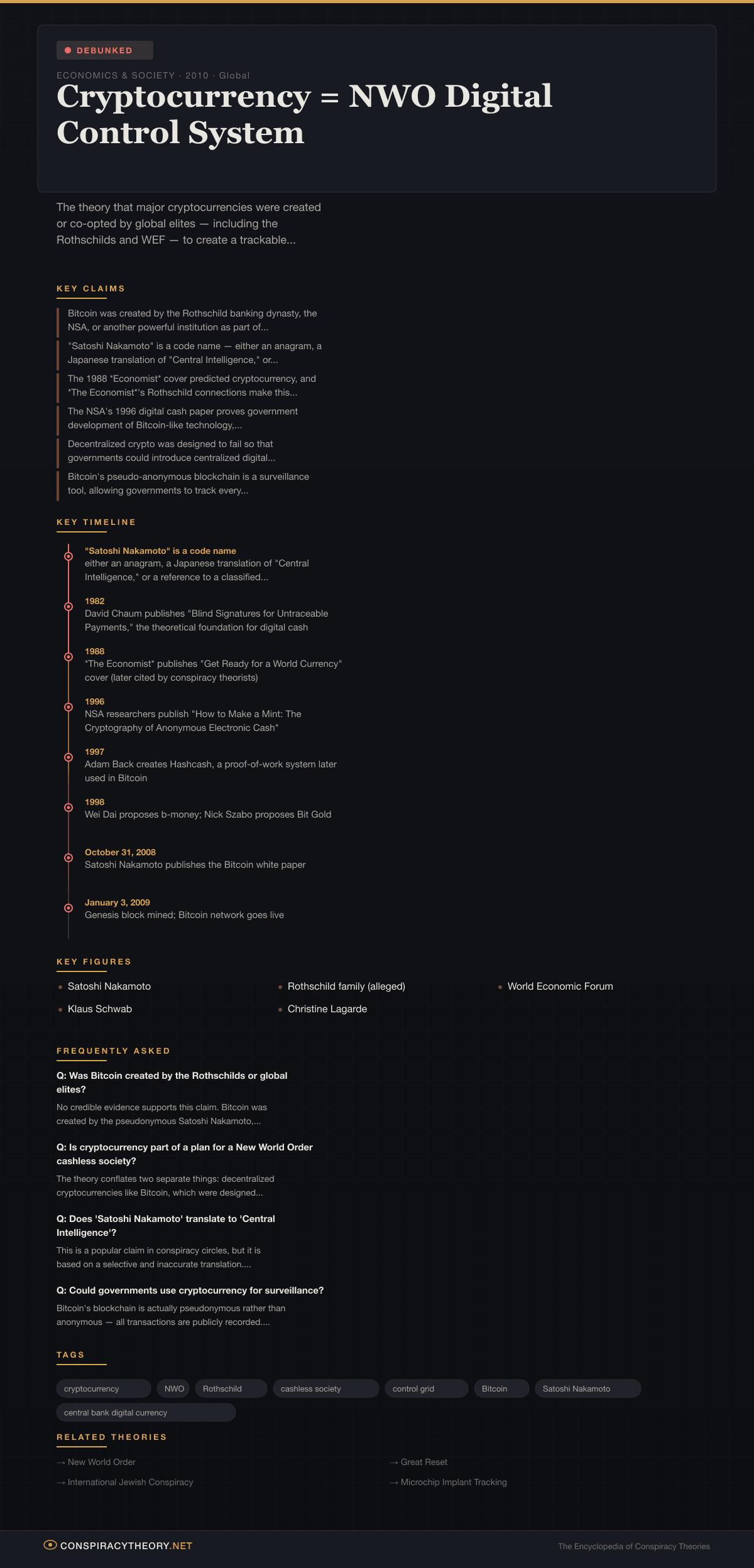 The crypto-NWO theory sits at the intersection of two powerful cultural currents: the centuries-old tradition of financial conspiracy theories and the twenty-first century anxieties about digital surveillance and cashless societies.