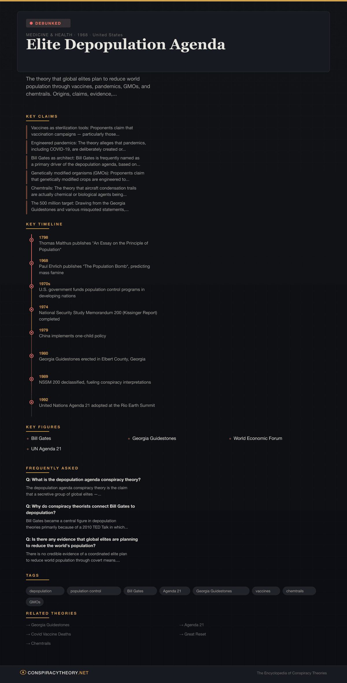 The depopulation agenda conspiracy theory is the claim that a secretive cabal of global elites — including billionaires, international organizations, government leaders, and pharmaceutical corporations — is engaged in a deliberate, coordinated plan to dramatically reduce the world’s population. Proponents allege the target is between 500 million and one billion people, down from the current global population of approximately eight billion, and that this reduction is being carried out through engineered pandemics, contaminated vaccines, genetically modified organisms, chemical spraying from aircraft, forced sterilization, and manufactured food shortages.