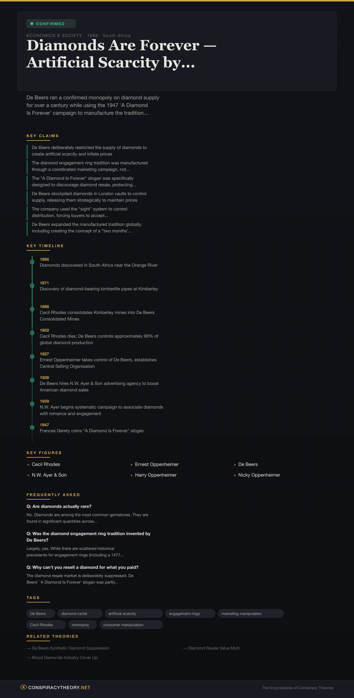 The De Beers diamond conspiracy is one of the most thoroughly documented and widely acknowledged corporate conspiracies in modern history. For over a century, the De Beers company and its predecessors maintained a near-total monopoly on the global diamond supply, artificially restricting the flow of diamonds to market to create the illusion of scarcity and sustain prices far above what a competitive market would produce. Simultaneously, through one of the most successful advertising campaigns ever created, De Beers manufactured the cultural tradition of the diamond engagement ring and embedded it so deeply in Western (and eventually global) culture that most people today consider it an ancient custom rather than a 20th-century marketing invention.