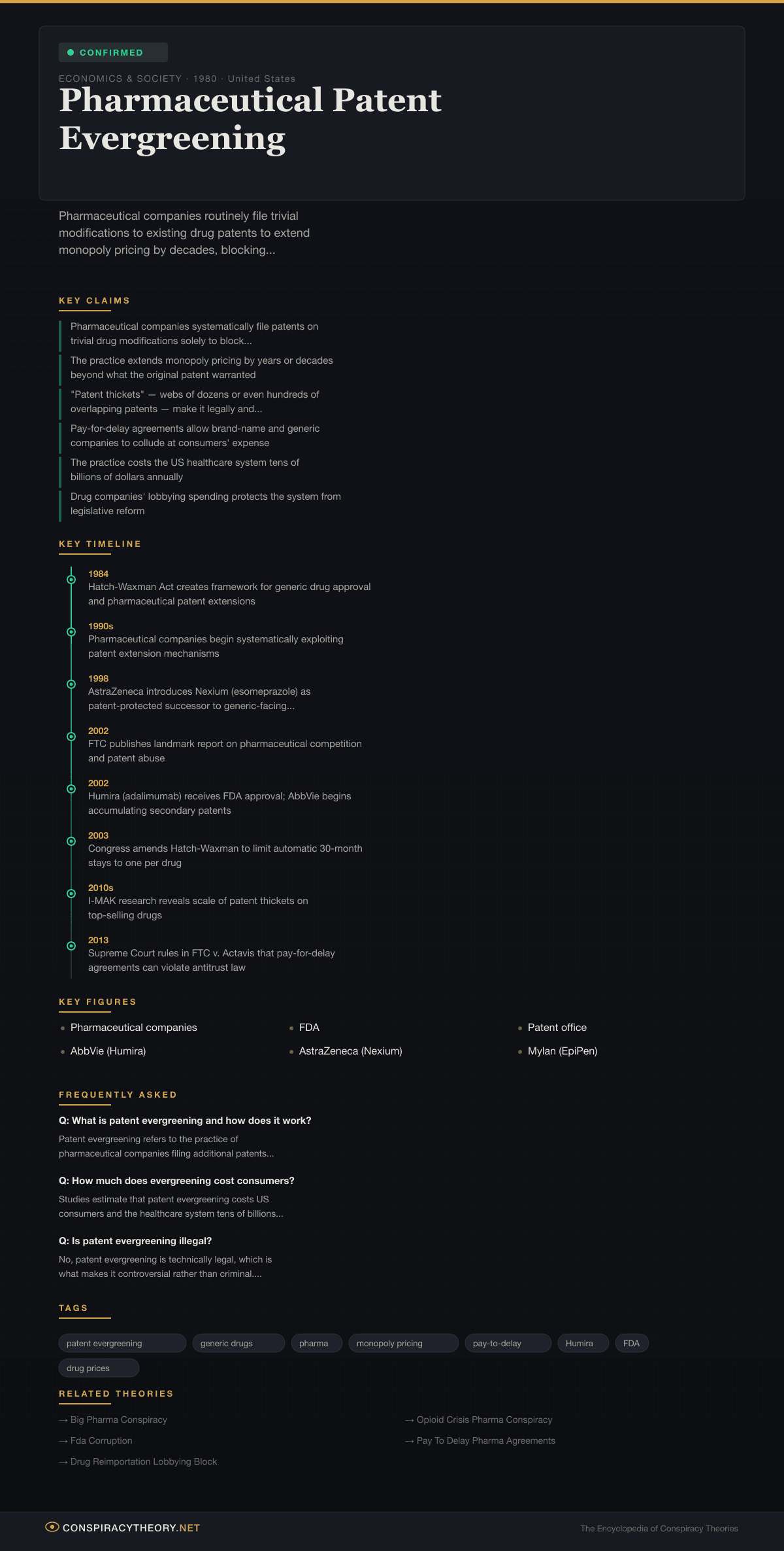 Pharmaceutical patent evergreening is one of the most well-documented and consequential corporate practices in the American healthcare system. The term refers to the strategy by which drug companies file additional patents on minor modifications to existing medications — new formulations, delivery methods, dosing schedules, or even new crystal structures of the same active ingredient — to extend their monopoly pricing power far beyond the original patent’s 20-year term. This practice is not a conspiracy theory in the traditional sense: it is a confirmed, systematically documented strategy that is technically legal but operates in ways its critics argue were never intended by patent law.