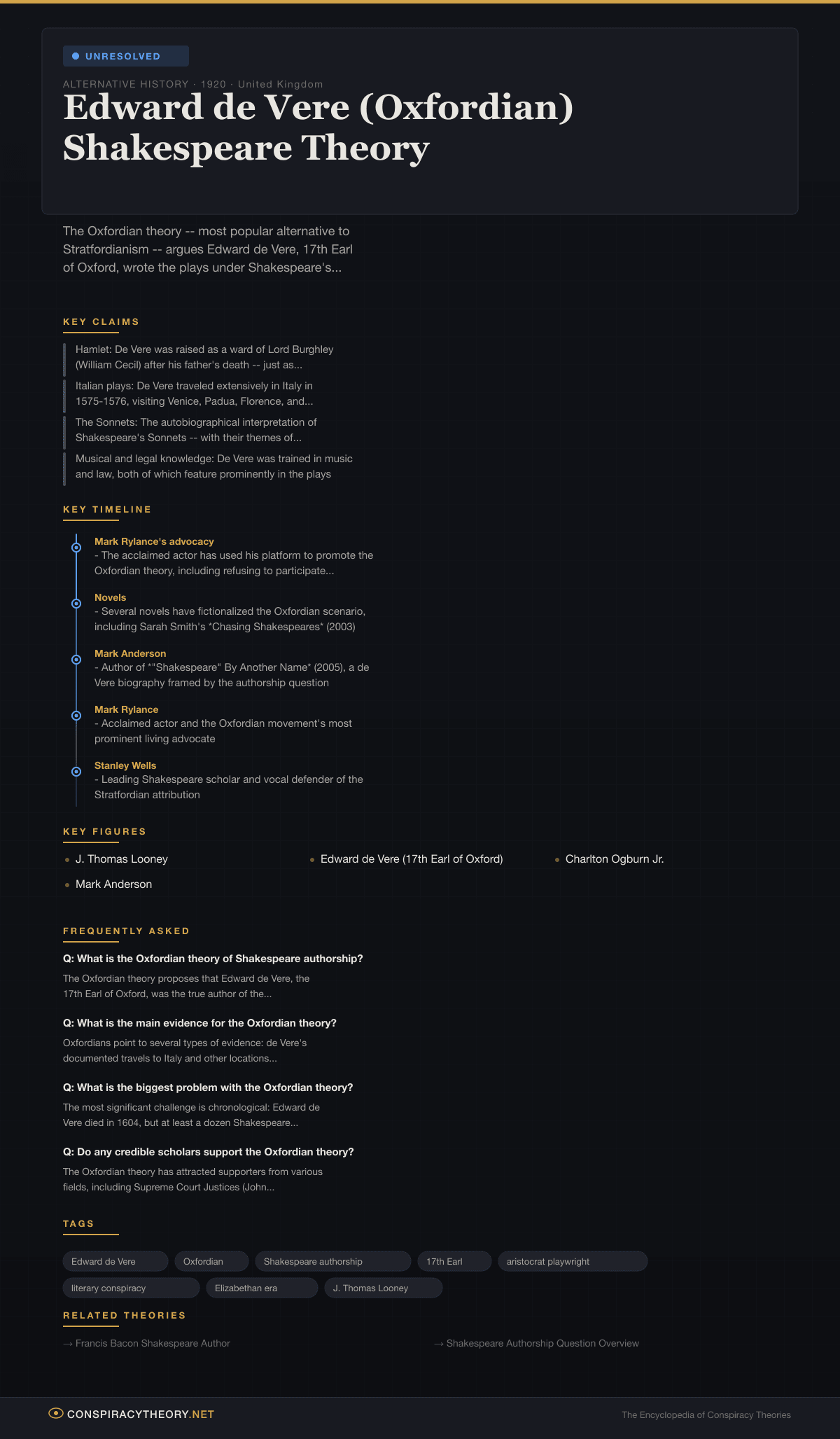 The Oxfordian theory is classified as unresolved not because the evidence is evenly balanced — mainstream scholarly opinion overwhelmingly favors the Stratford attribution — but because the question is inherently difficult to settle definitively with four-century-old evidence.