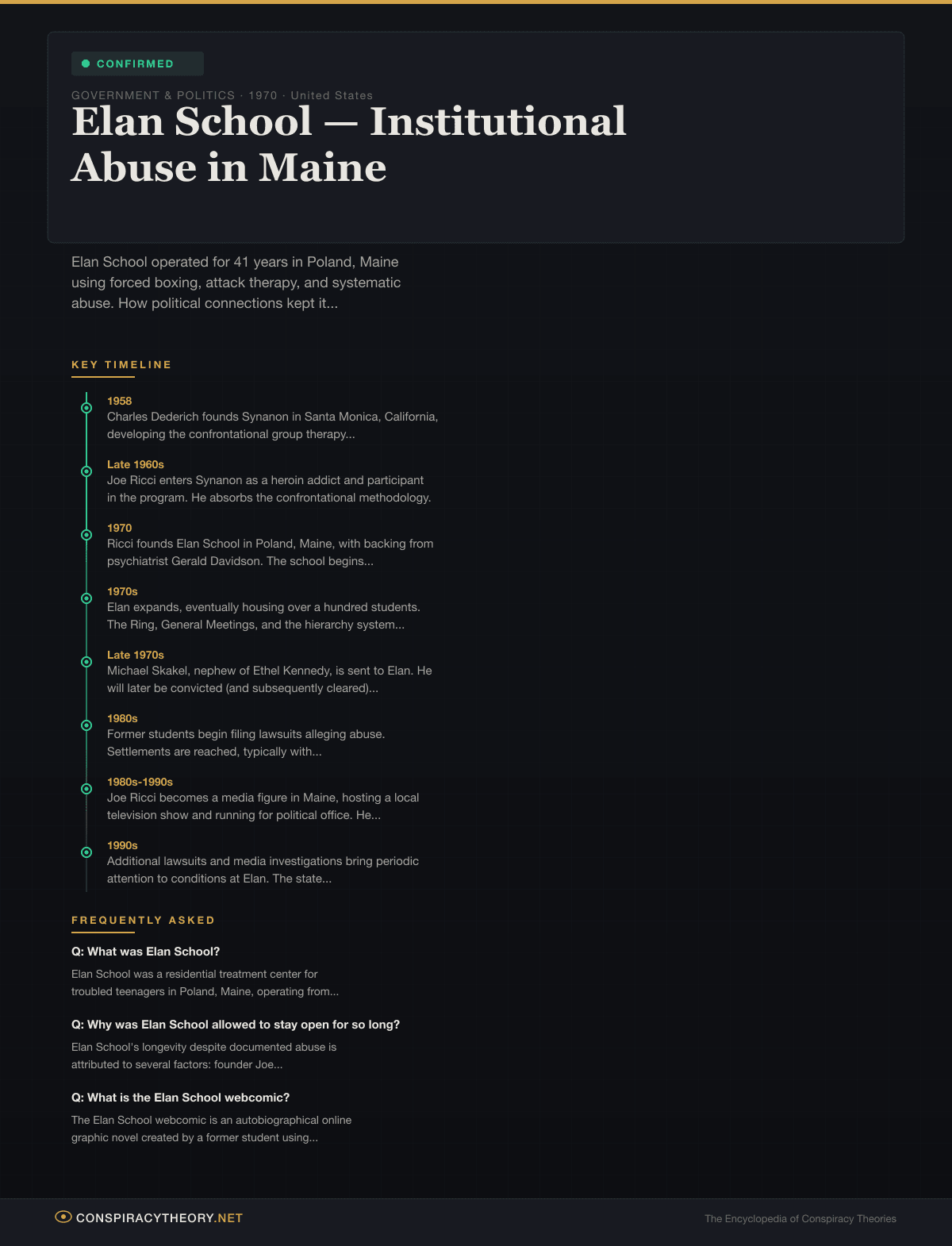 - 1970 — Ricci founds Elan School in Poland, Maine, with backing from psychiatrist Gerald Davidson. The school begins accepting teenagers referred by courts, state agencies, and parents.