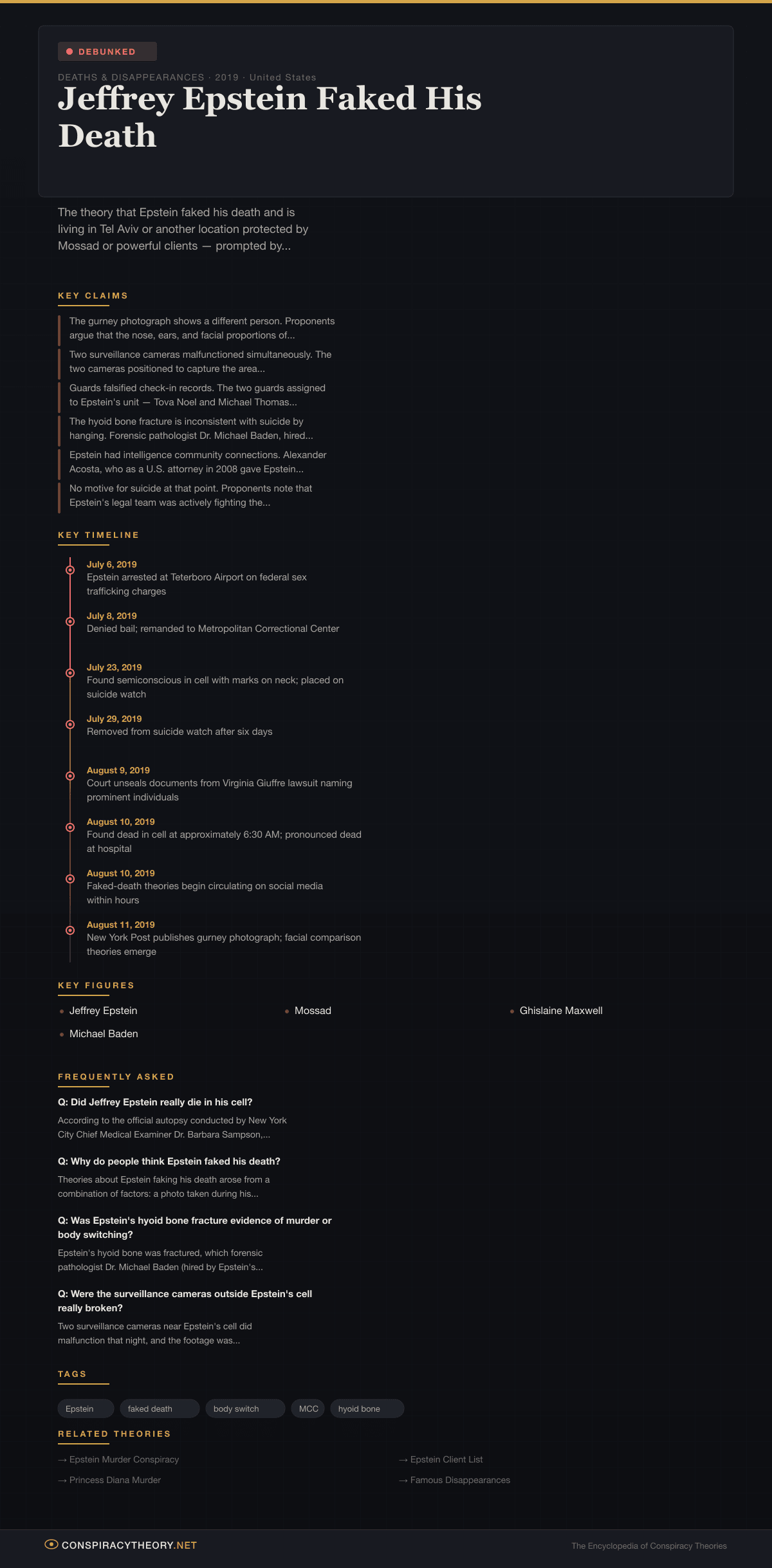 - Epstein Murder Conspiracy — the competing theory that Epstein was killed to prevent him from testifying