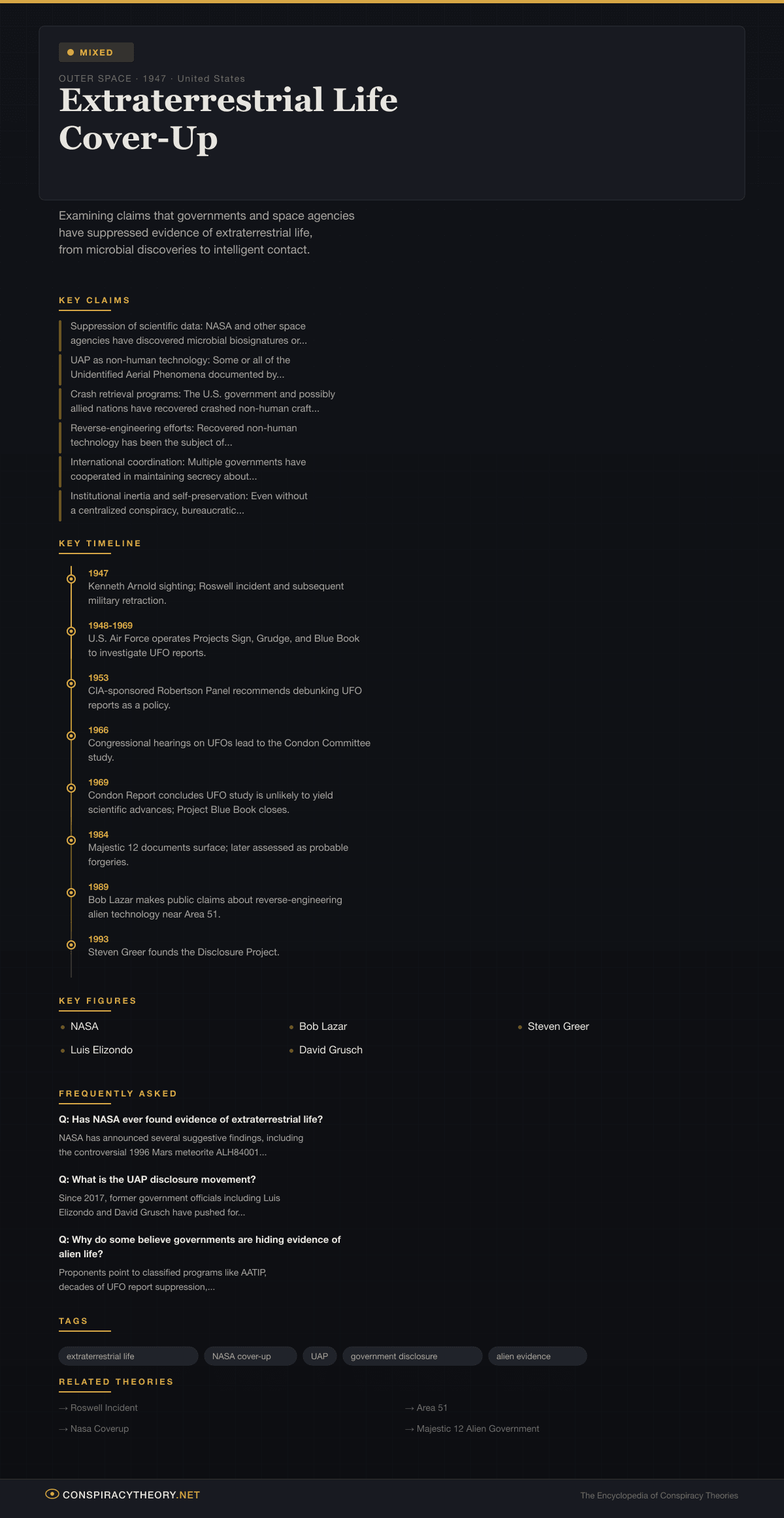 The Extraterrestrial Life Cover-Up is a broad constellation of claims alleging that governments — principally the United States government and NASA — have discovered or obtained evidence of extraterrestrial life and have systematically suppressed that information from public knowledge. The theory spans a wide spectrum: at one end, relatively modest assertions that space agencies have downplayed ambiguous biosignature data from Mars missions; at the other, dramatic allegations that the U.S. military has recovered crashed alien spacecraft and biological specimens and has maintained decades-long reverse-engineering programs in classified facilities.