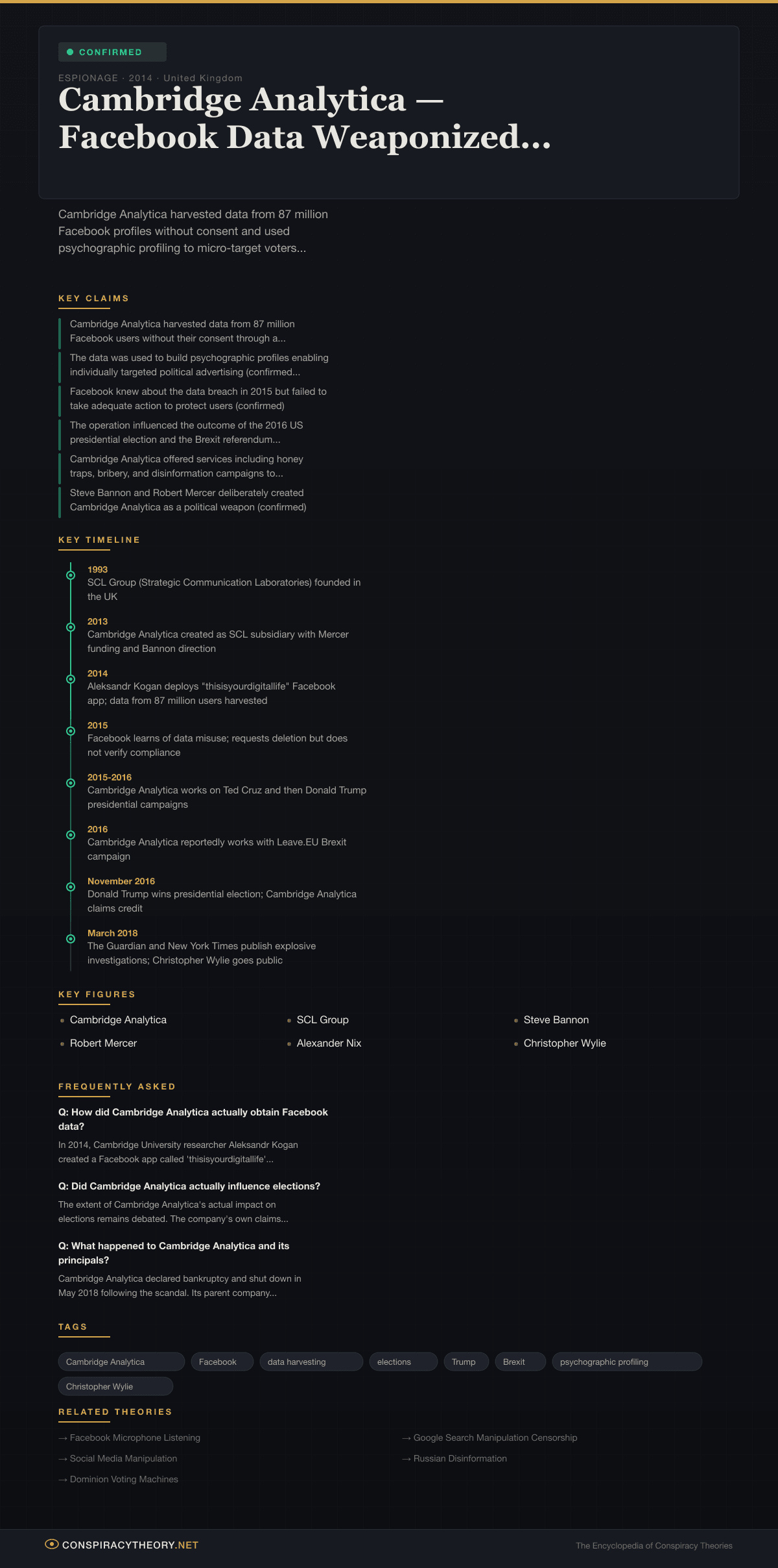 The Cambridge Analytica scandal is a confirmed conspiracy in which a British political consulting firm harvested the personal data of up to 87 million Facebook users without their knowledge or consent and used that data to build psychological profiles for targeted political advertising. The operation, which involved the Trump 2016 presidential campaign, the Brexit Leave campaign, and numerous elections worldwide, was exposed in 2018 by whistleblower Christopher Wylie and investigative journalists at The Guardian and The New York Times, triggering the largest data privacy crisis in social media history.