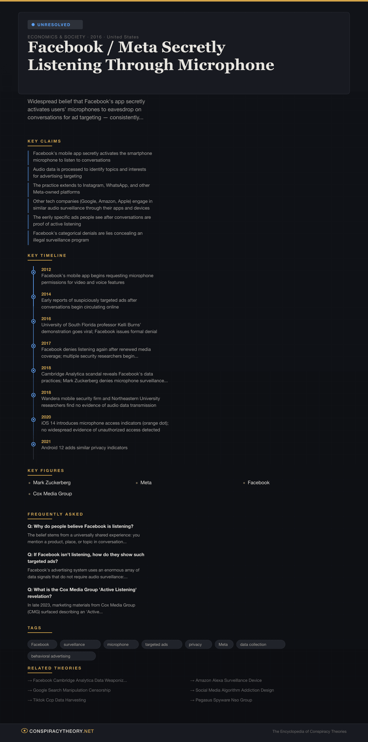 - 2018 — Cambridge Analytica scandal reveals Facebook’s data practices; Mark Zuckerberg denies microphone surveillance in congressional testimony