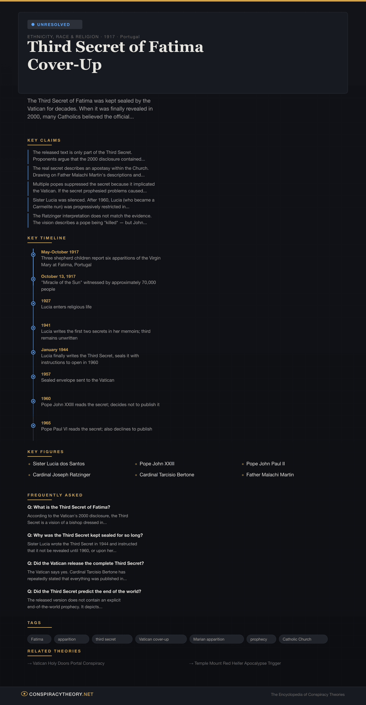 For a significant faction of Catholic traditionalists, theologians, and Vatican watchers, the answer was — and remains — no. The Third Secret of Fatima cover-up theory holds that the Vatican released only part of the secret in 2000, and that the most explosive content — allegedly describing an apostasy within the Church, a crisis of faith, and possibly the end of the papacy as it has been known — remains locked in Vatican archives. It is a conspiracy theory that unfolds entirely within the walls of the world’s oldest institution, argued by people who believe deeply in the institution’s divine mission, which makes it unlike anything else in this encyclopedia.