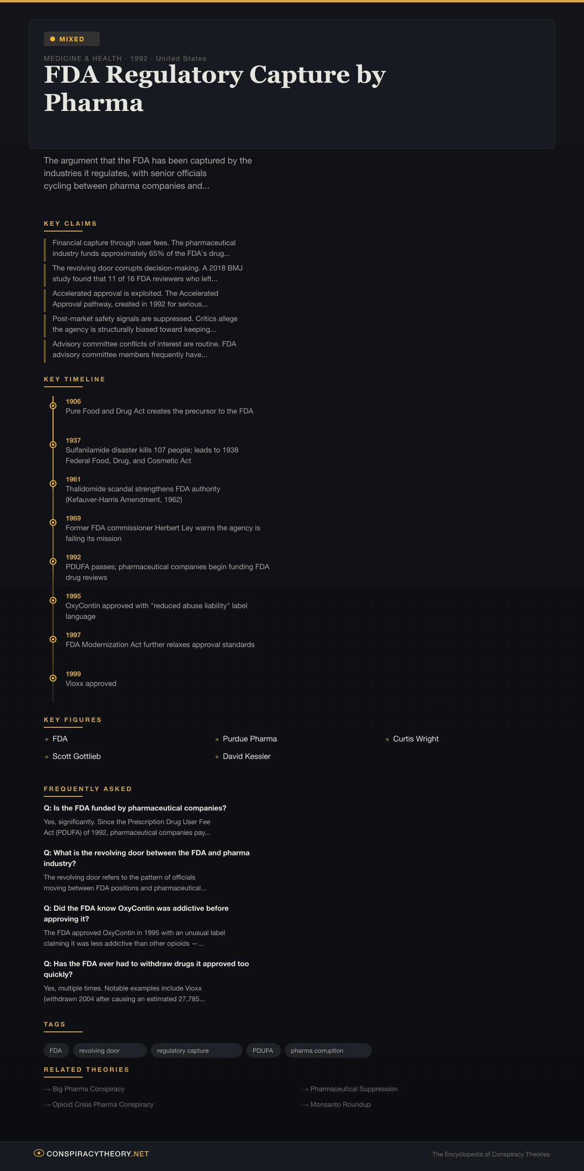 The theory of FDA regulatory capture is unusual in the conspiracy landscape because large parts of it are simply documented fact. The pharmaceutical industry does fund the majority of the FDA’s drug review operations. Officials do cycle between the agency and the industry. Drugs have been approved and then withdrawn after causing deaths. The question is not whether these things happen — they demonstrably do — but whether they constitute a deliberate conspiracy or merely the predictable dysfunction of an underfunded regulatory system operating under political pressure.