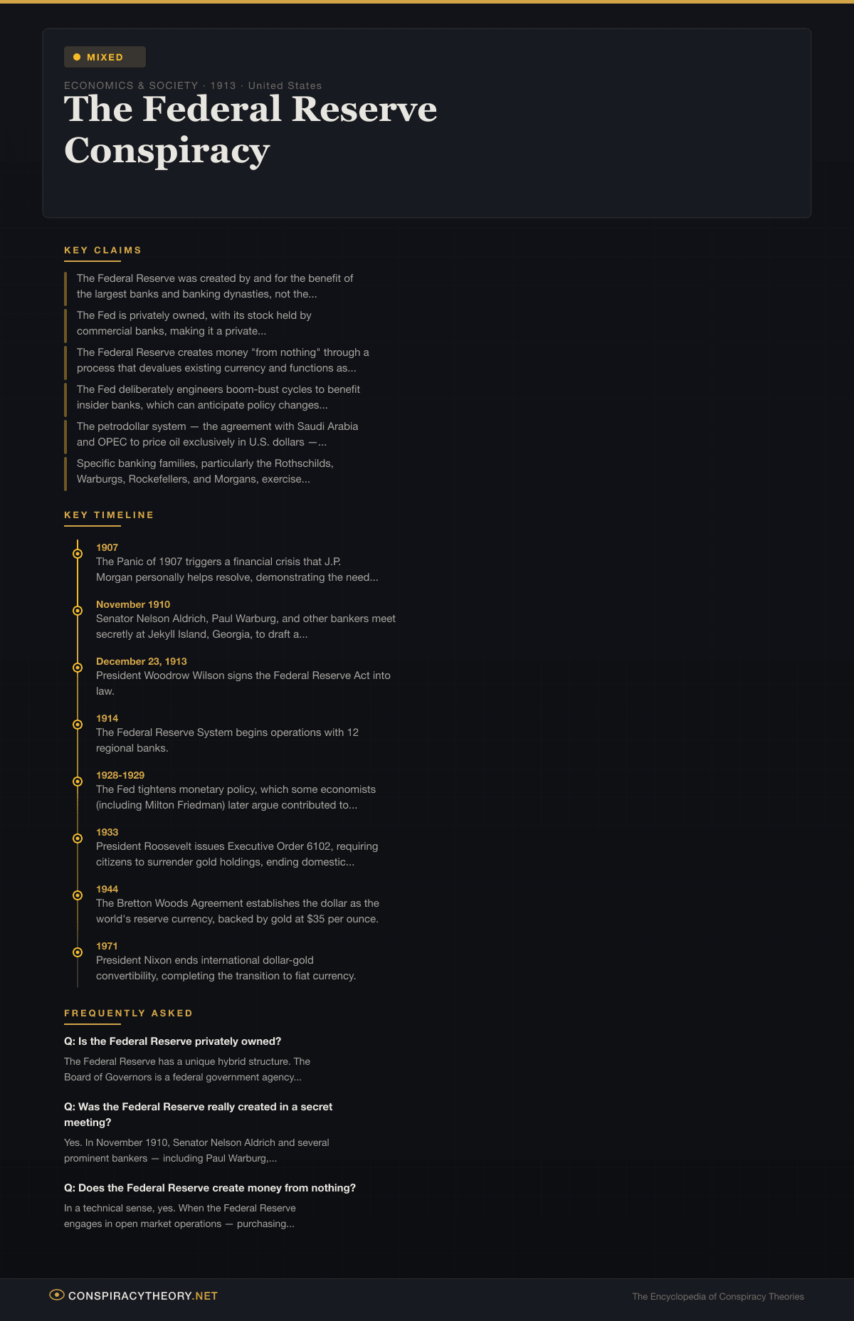 The Federal Reserve System, established by the Federal Reserve Act of 1913, is the central bank of the United States and one of the most powerful financial institutions in the world. It sets interest rates, regulates banks, manages the money supply, and serves as the lender of last resort during financial crises. It is also the subject of one of the most persistent and multifaceted conspiracy theories in American history.