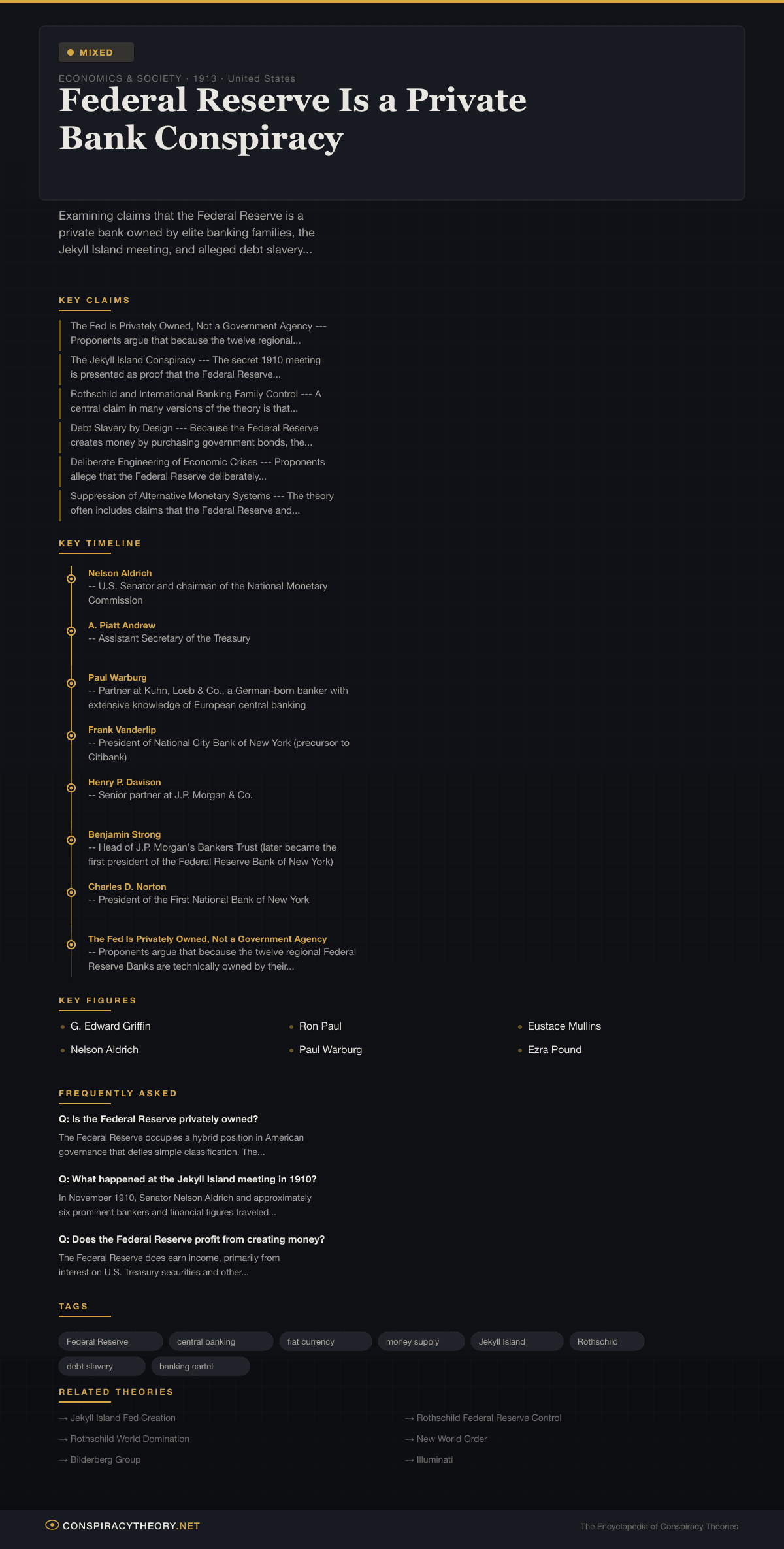 The Jekyll Island Conspiracy --- The secret 1910 meeting is presented as proof that the Federal Reserve was designed by and for private banking interests. Proponents argue that the same banking houses that designed the system became its primary beneficiaries, and that the secrecy surrounding the meeting demonstrates conspiratorial intent rather than political pragmatism.