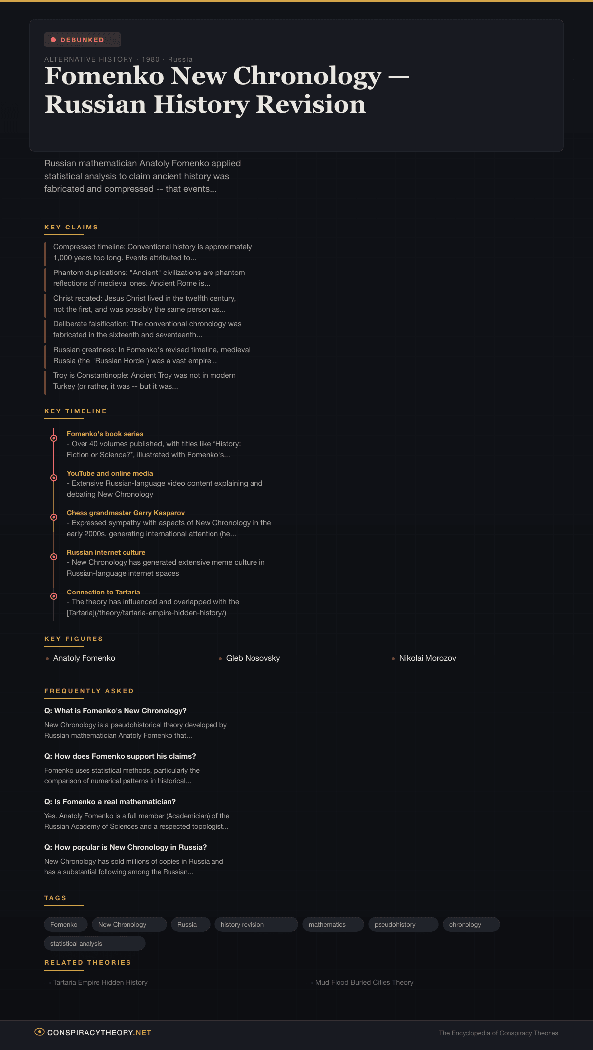 - Anatoly Fomenko (b. 1945) — Russian mathematician, Academician, and the theory’s creator. His genuine mathematical accomplishments make him one of the most credentialed pseudohistorians in history