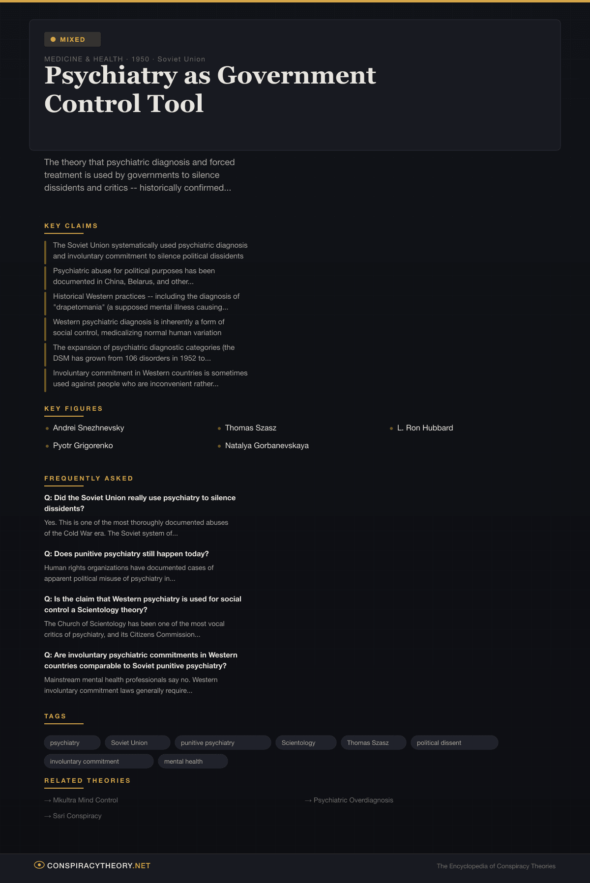The key distinction is between documented systematic political abuse (the Soviet model) and the more diffuse concern that psychiatric authority can be misused in any system. The former is historical fact. The latter is a legitimate topic of debate that does not require a conspiracy theory framework.