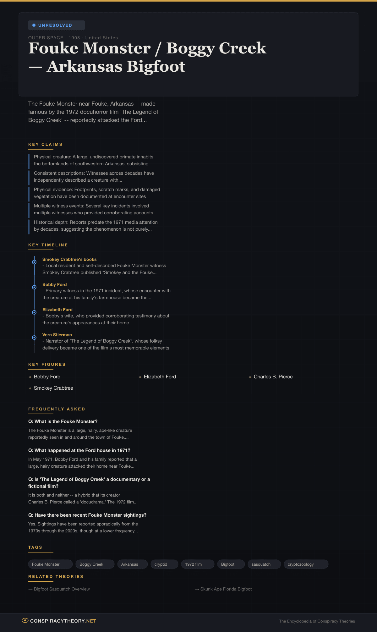 The Fouke Monster is classified as unresolved — which is the honest assessment for a case that features credible witnesses but no definitive physical evidence.