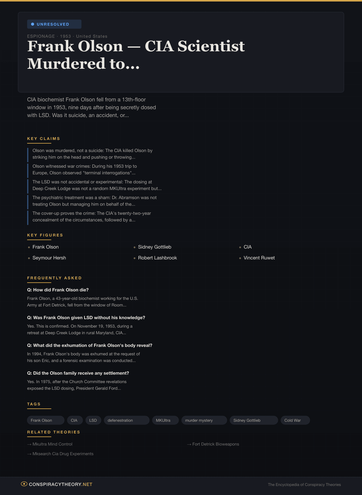 The Frank Olson case sits at the intersection of confirmed conspiracy and unresolved mystery. The confirmed elements are extraordinary enough on their own: a U.S. government scientist was drugged without his knowledge or consent as part of MKUltra, the CIA’s illegal mind-control program. He experienced a severe psychological crisis. He was dead within ten days. The CIA covered up the circumstances for over twenty years. These facts are not in dispute. What remains unresolved — and may never be definitively settled — is whether Olson jumped, fell, or was pushed.
